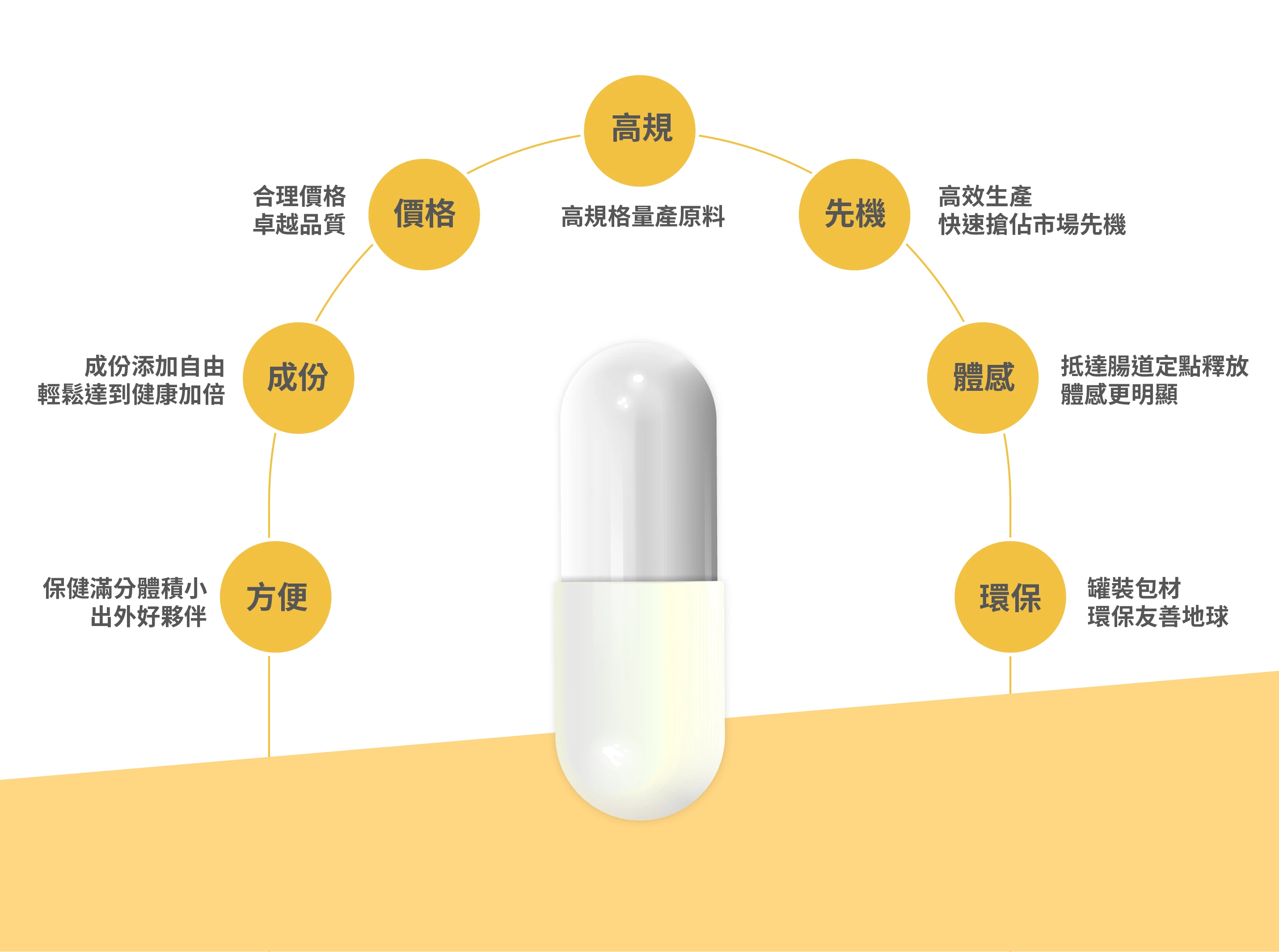 7.搶占市場先機:包裝速度快速,膠囊製成後,裝罐貼標即可上市。