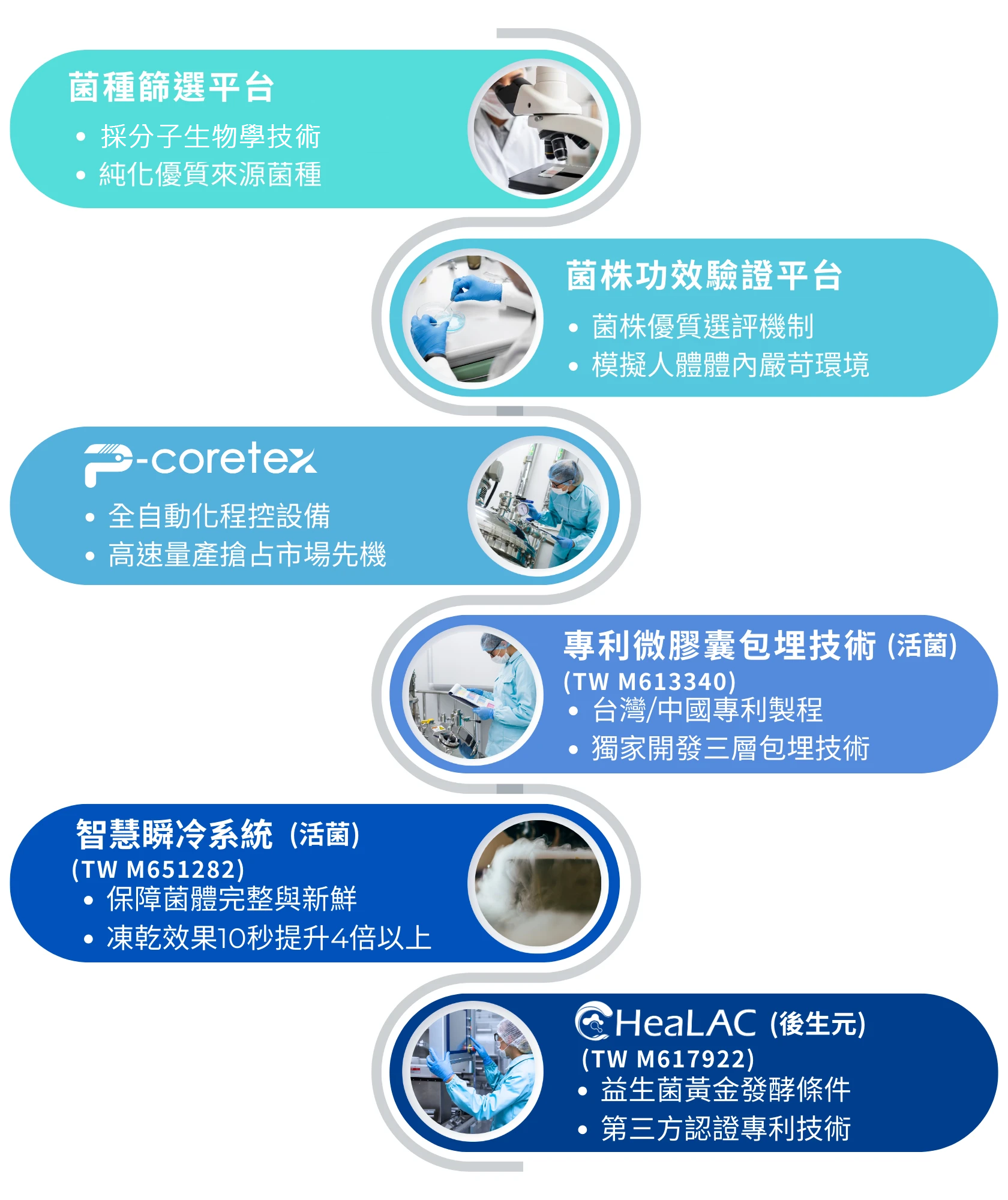 導入熱鎖存技術(TW M617922),將高機能性益生菌菌株經48小時黃金發酵,以最適熱處理條件鎖住益菌發酵精華,並為其菌株即刻補充所需營養物質,創造高價值、高穩定的後生元保健原料。