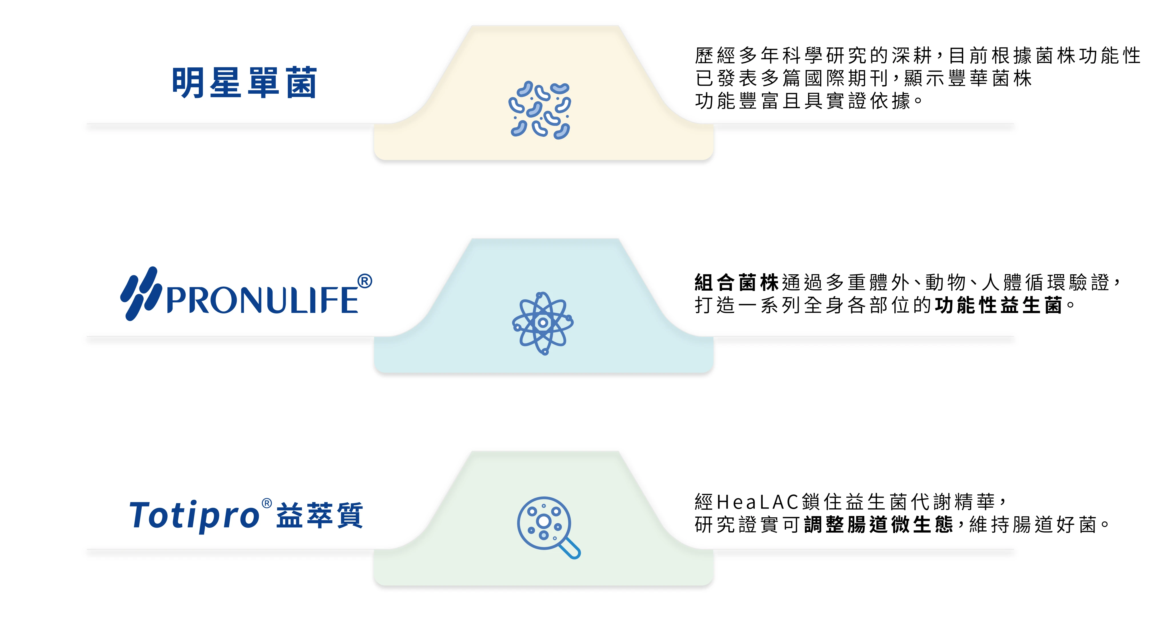 PRONEX®製程不僅創造出明星單菌,還擁有上百種功效專利的功能性益生菌PRONULIFE®品牌菌粉,以及全球領先的後生元Totipro®益萃質。製程透明公開且高規格量產,聚集菌種篩選與功效驗證平台,擁有專業製程專利,打造獨家益生菌製程技術,為全球企業客戶提供頂級益生菌保健原料。