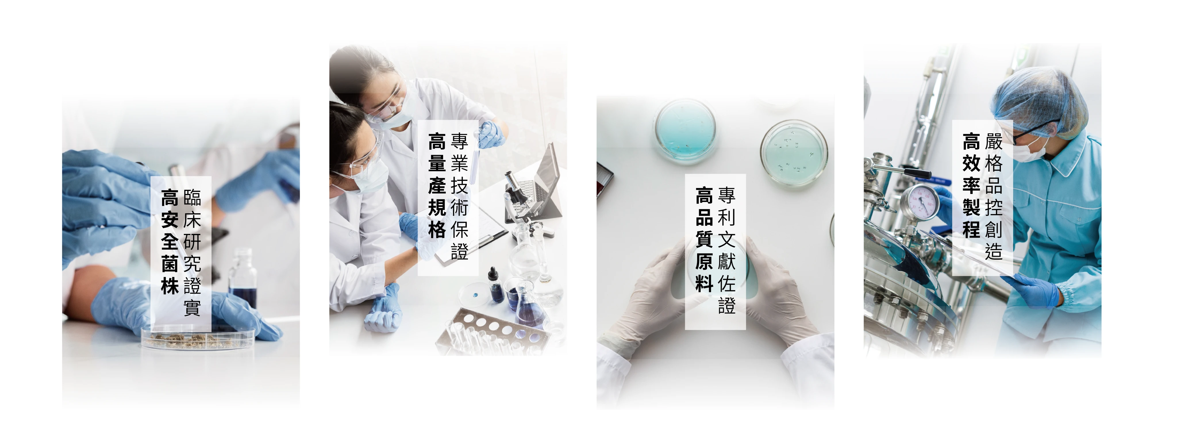針對潛力菌株的原物料製造,創造全球領先專屬益生菌高量產製造技術,專為益生菌量身打造生長和代謝產物的最適環境條件,在廠內設置全自動化程控設備,製程透明,所有材料均以管線運輸,排除所有人為因素造成的品質差異,讓益生菌原料擁有高穩定品質,使原物料的安全性與安定性更加有保障,且高規格化量產效率使產品擁有搶占市場先機的能力。