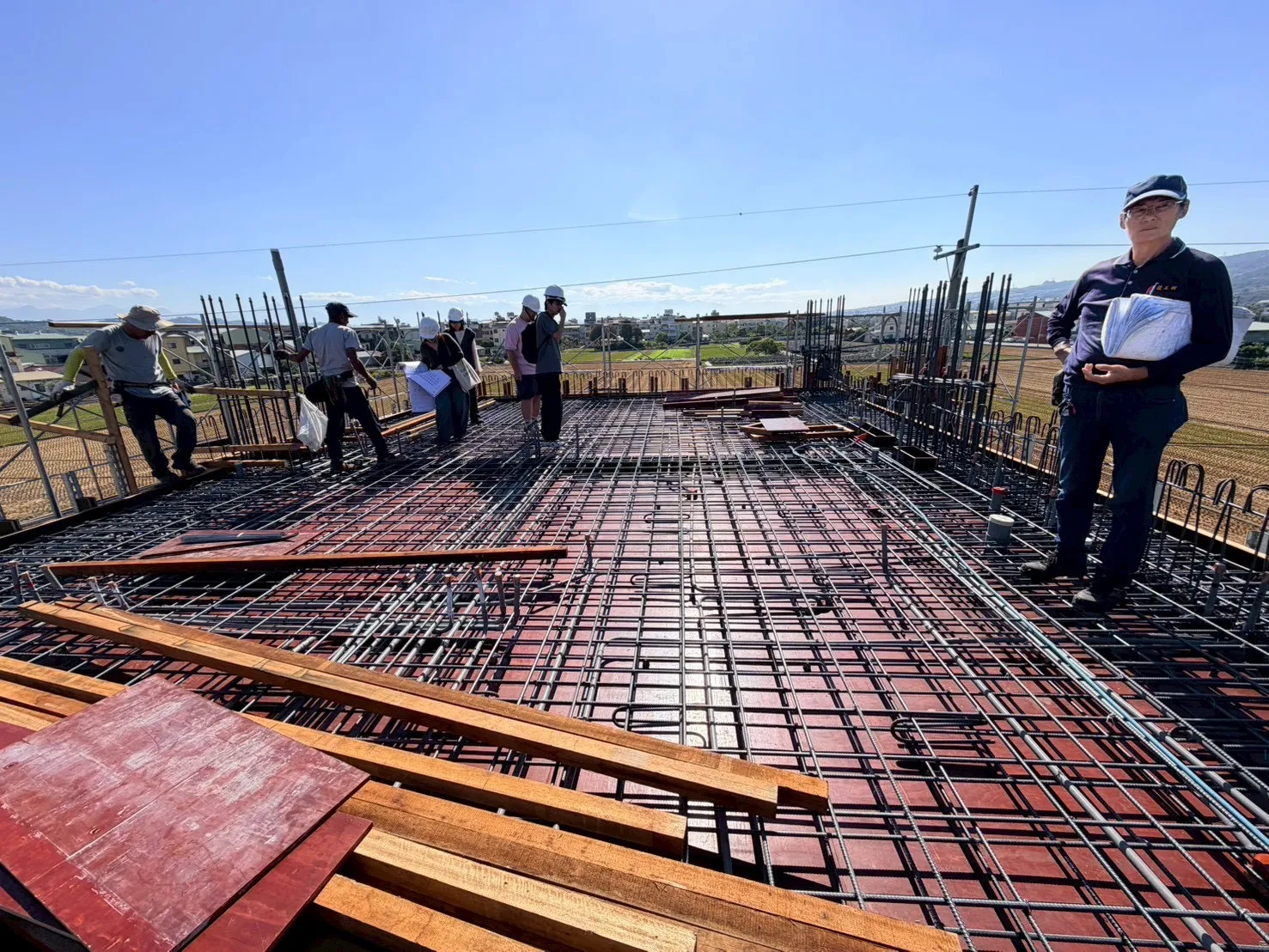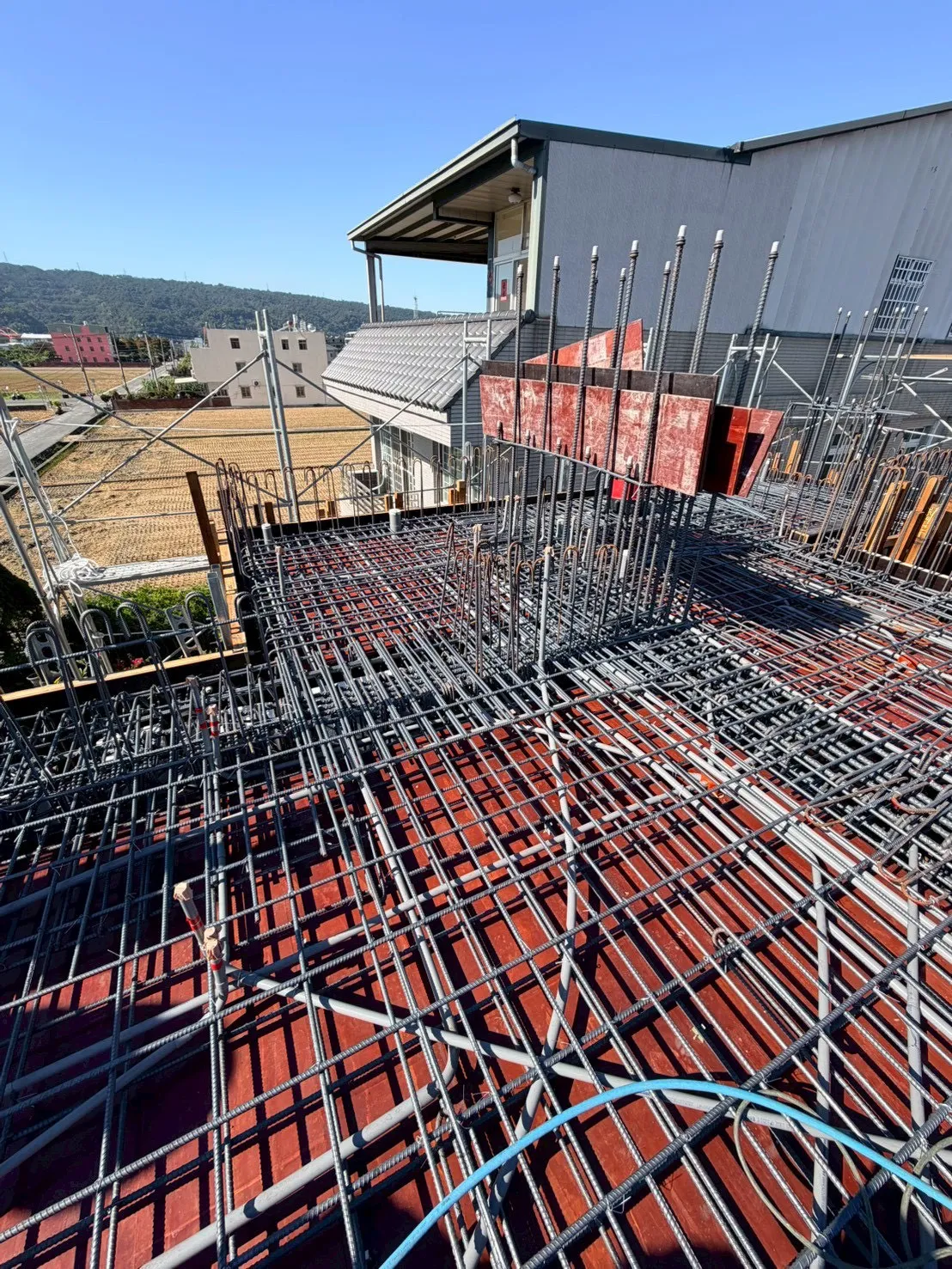 目前二樓頂部樓板模板已完整鋪設,鋼筋綁紮密實,整體勘驗工程進度順利,準備進入混凝土澆置作業囉,亦代表二樓主體結構即將完成。