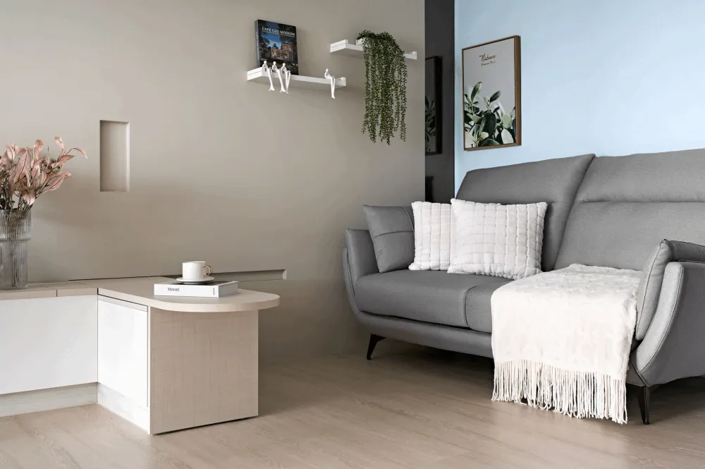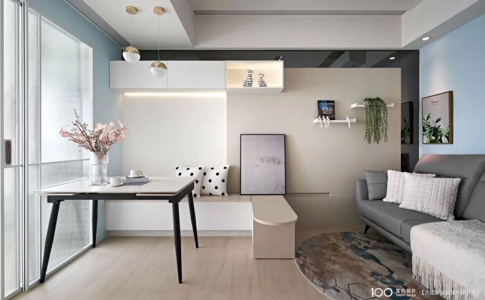 北歐風小宅只有14坪,以一物多用的設計化解坪效侷限,最有巧思的是客餐廳區結合L型臥榻與矮櫃的滑動式桌面,平時可作茶几,需用時拉出,即可變身餐桌或工作桌,使用彈性高,不佔空間,用完即可收入原位,還能避免桌面雜物堆積,是小坪數空間中極具靈活性的亮點設計。