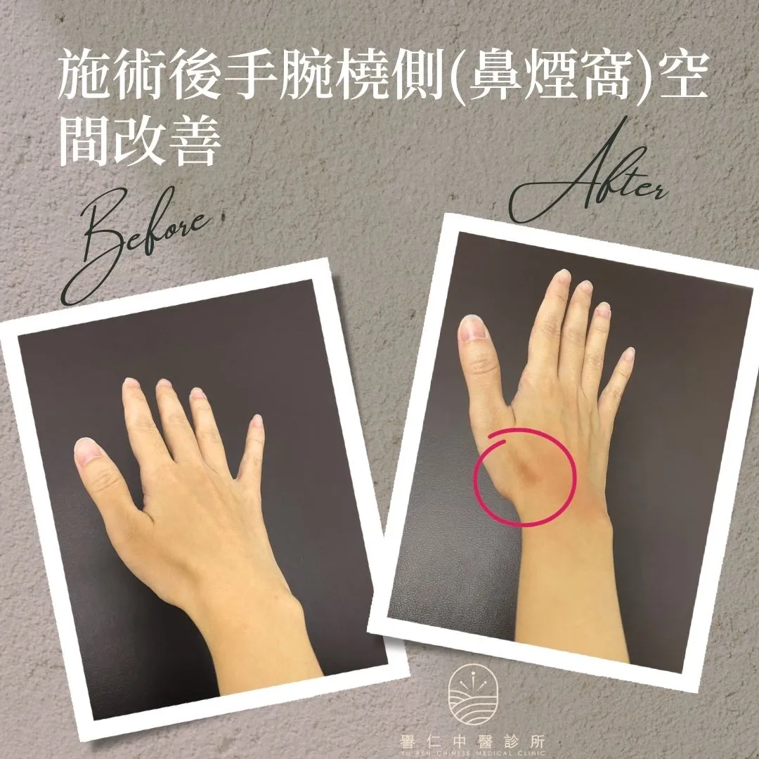仔細觸診後,發現陳小姐從頸、肩、肘都有筋膜張力不平整,骨架歪斜的情況。手腕橈側有明顯凹陷,經手法調整後,當場請陳小姐轉動手腕,並背屈壓床面,不舒服感當下緩解了許多。