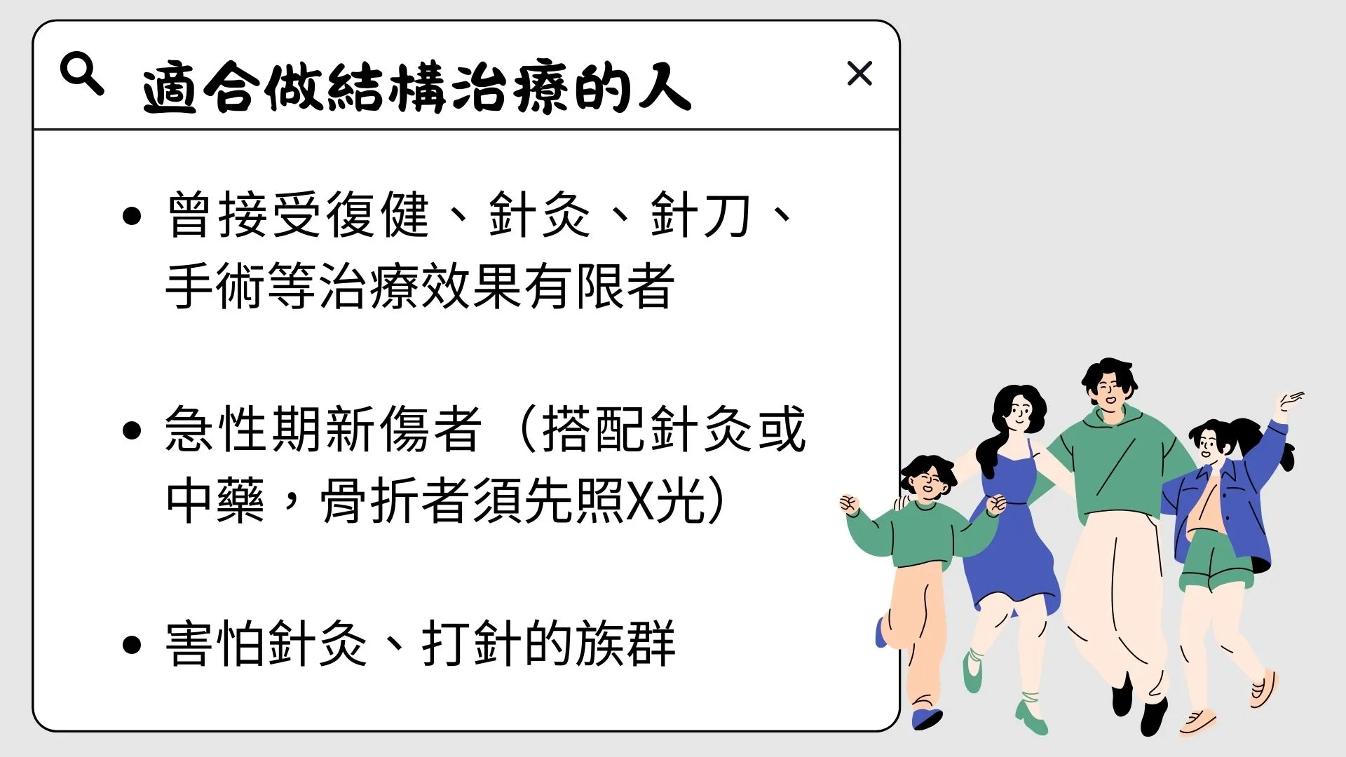 • 手法治療需花費一定時間,較不適合趕時間或缺乏耐心者