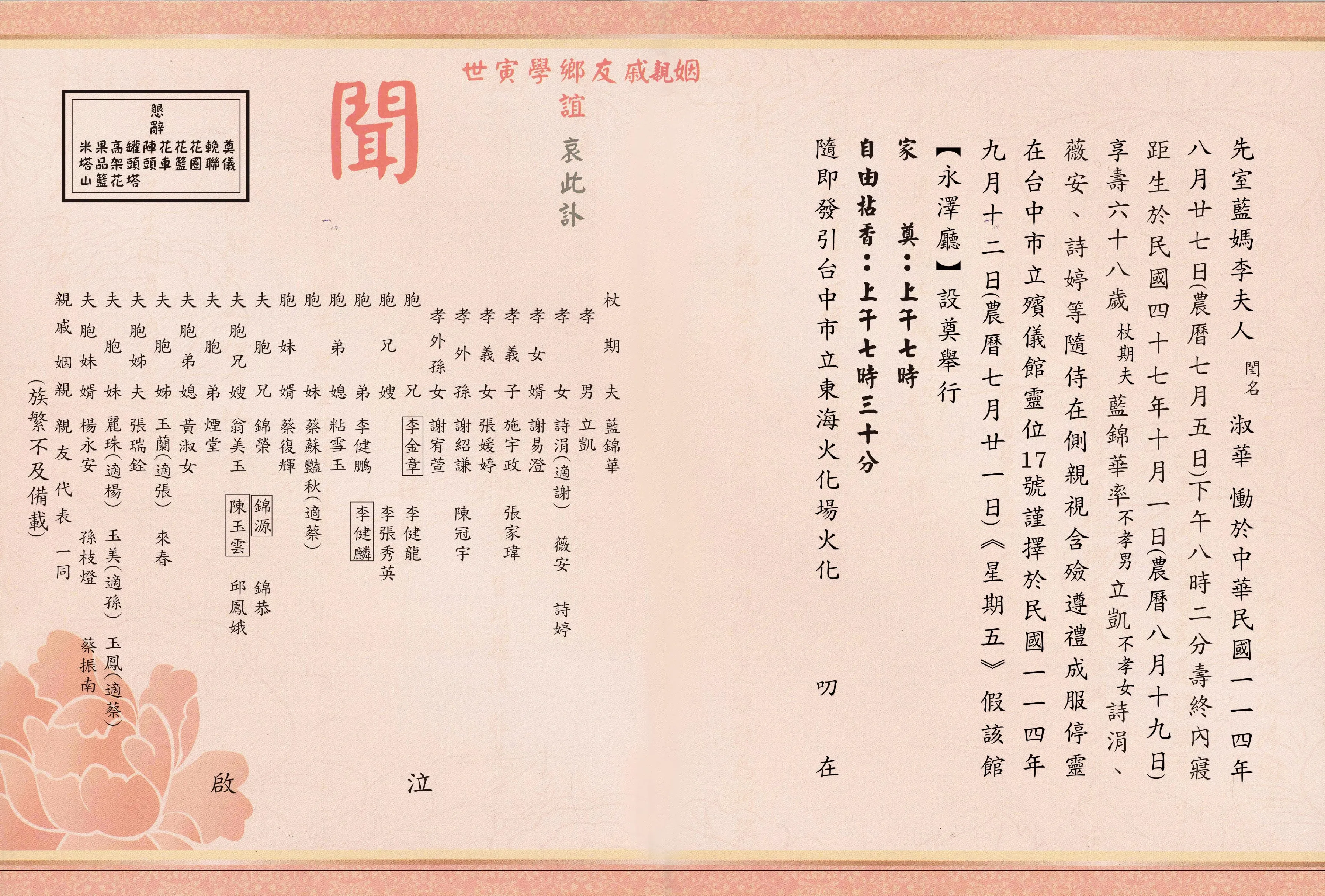 先室藍媽李淑華夫人慟於中華民國一一四年八月廿七日(農暦七月五日)星期三下午八時二分壽終內寢 距生於民國四十七年十月一日(農暦八月十九日) 享壽六十八歲