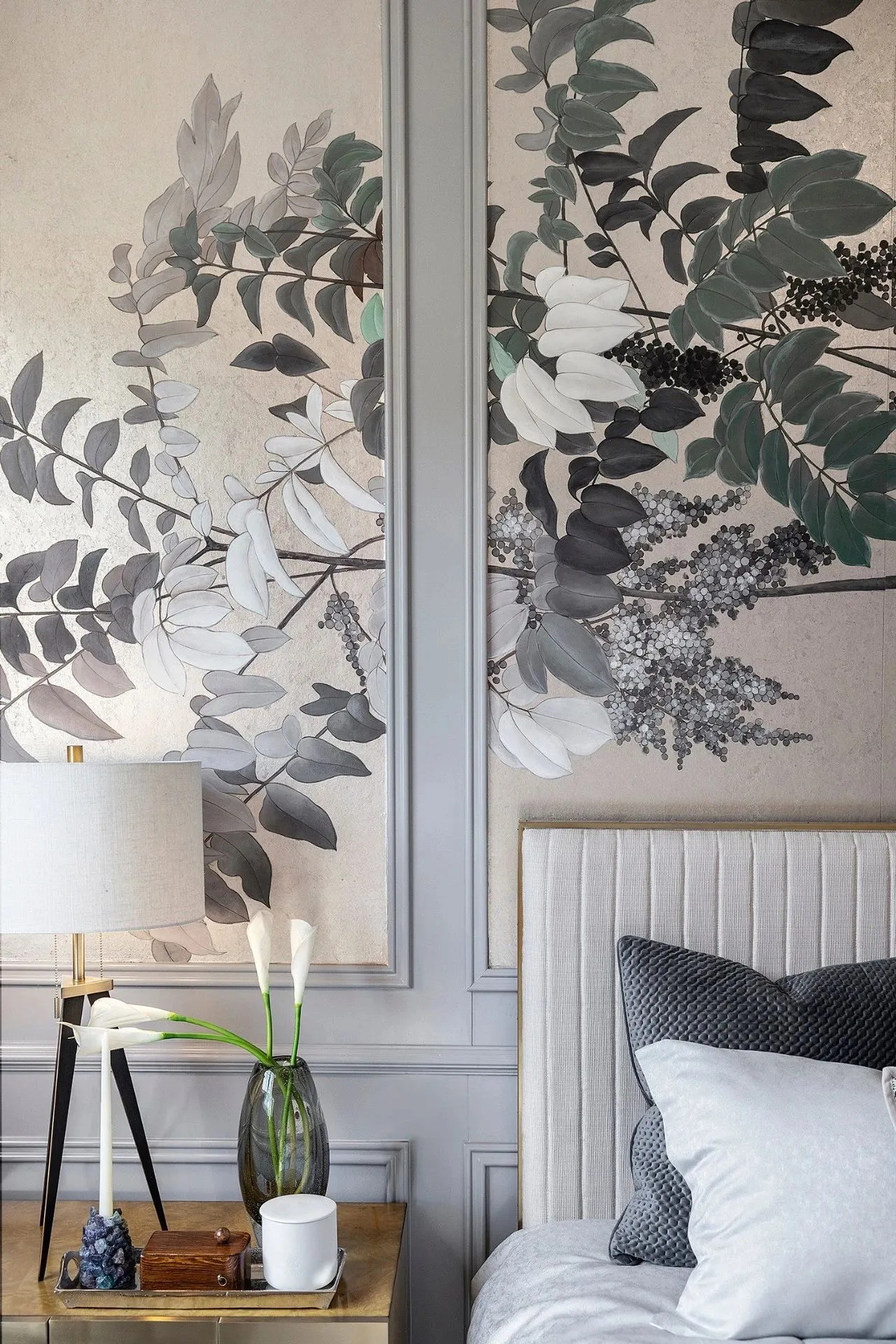 美式風格的臥室設計很適合使用壁紙作為床頭背板的設計,挑選適合的風格壁紙,可以提升整體風格的美感