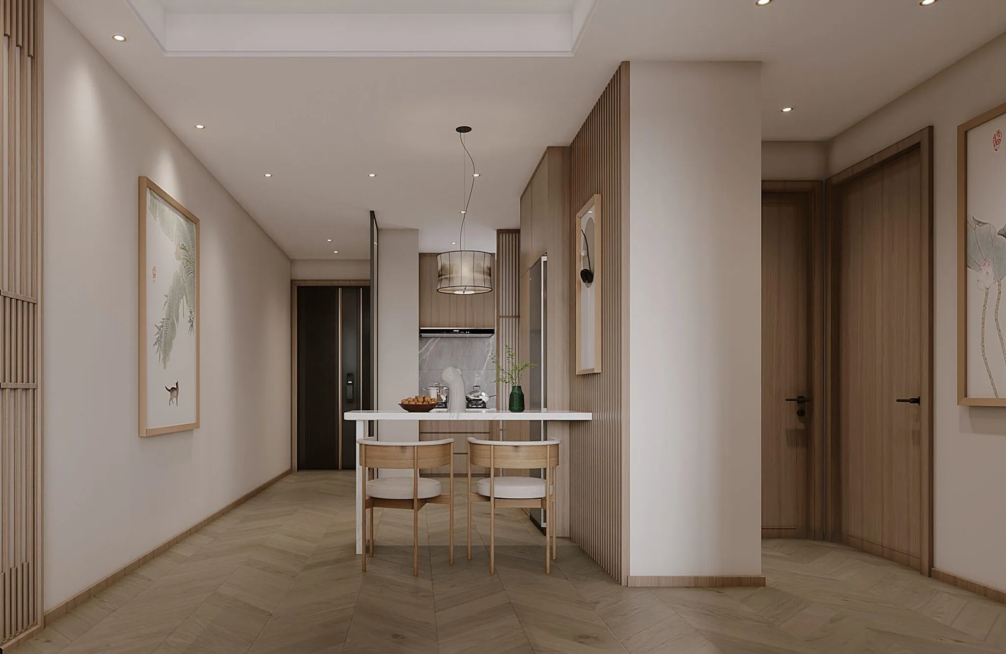 中式玄關講究對稱和韻律,強調文化意境。可以在玄關擺放具有傳統文化意義的裝飾品,如風景畫、陶瓷器皿等,營造典雅的氛圍。同時,可以選擇木質鞋櫃或屏風,為玄關增添古典韻味。