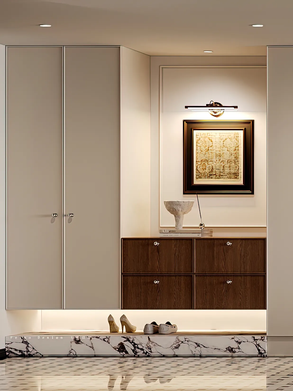 玄關一般較為狹窄,採光有限,因此合理的燈光設計非常重要。可選擇溫暖的暖白色燈光,營造舒適的氛圍。對於較小的玄關區域,可以使用射燈或嵌入式燈帶,避免佔用過多空間,同時提升光線效果。