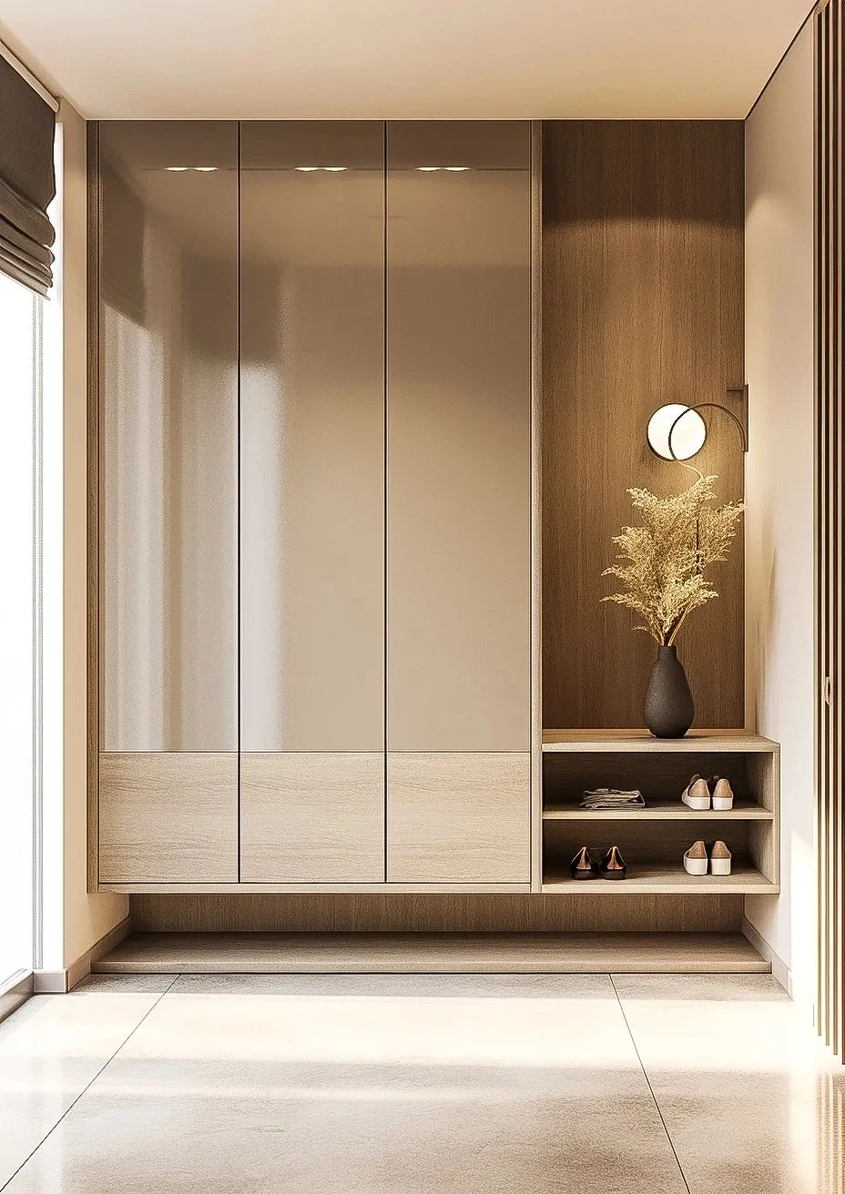 在玄關放置鏡子,既方便出門前整理儀容,又可以增加空間的視覺深度,特別適合小戶型的玄關設計。鏡子可以採用全身鏡或嵌入式設計,同時也能增加鏡子周圍的裝飾,提升美觀。