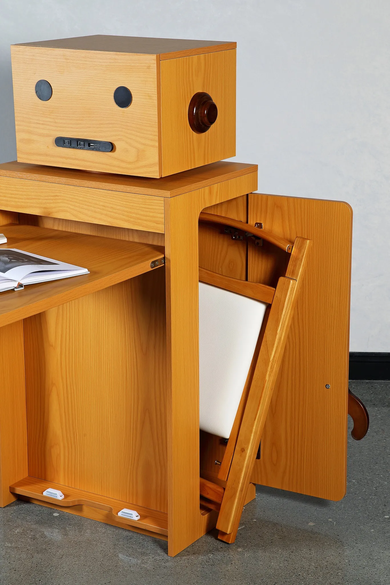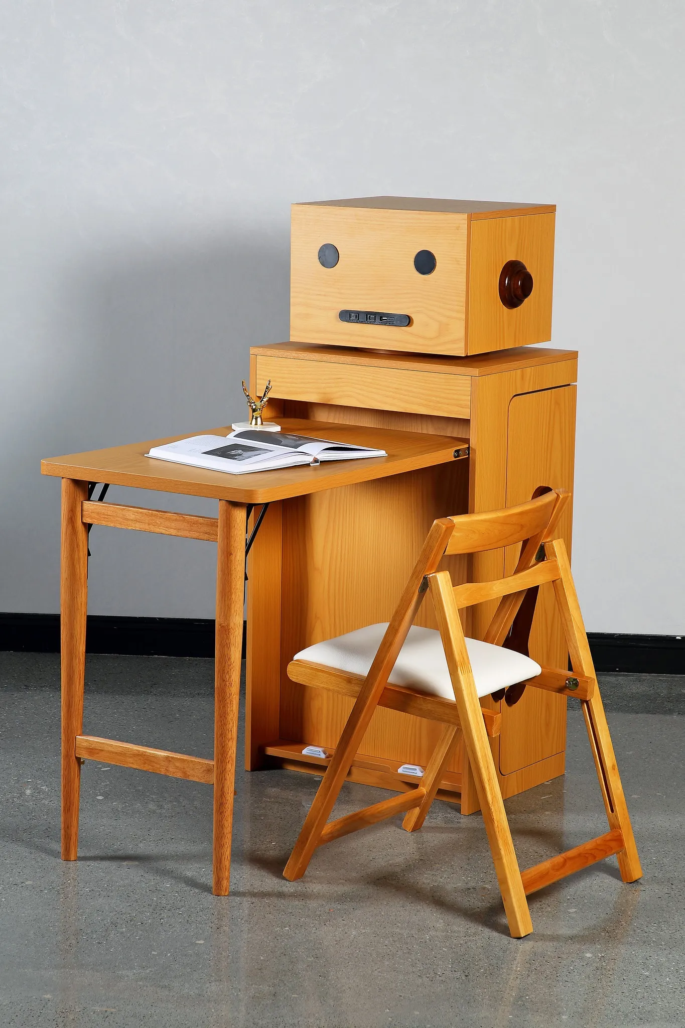側邊內藏可折疊座椅,輕輕打開即可取出,讓使用者在需要時有完整的桌椅配置。