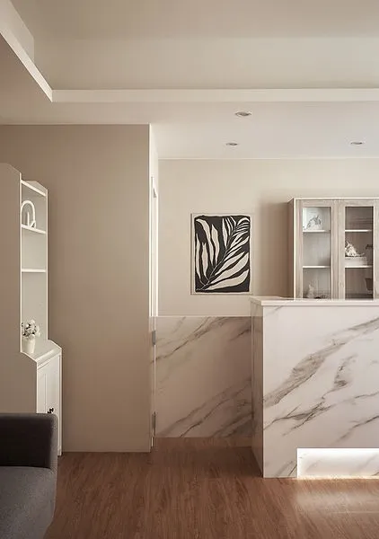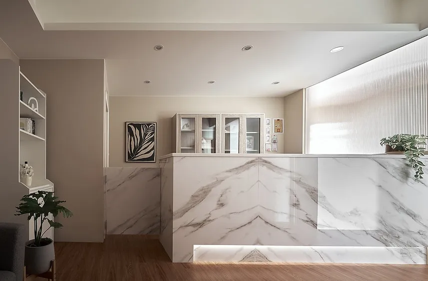 主要建材:雕刻白連紋板、長虹玻璃、系統櫃、抗菌人造石、塑膠地板、降噪門、洞石軟瓷磚、壁布