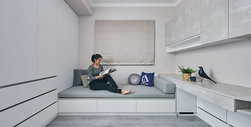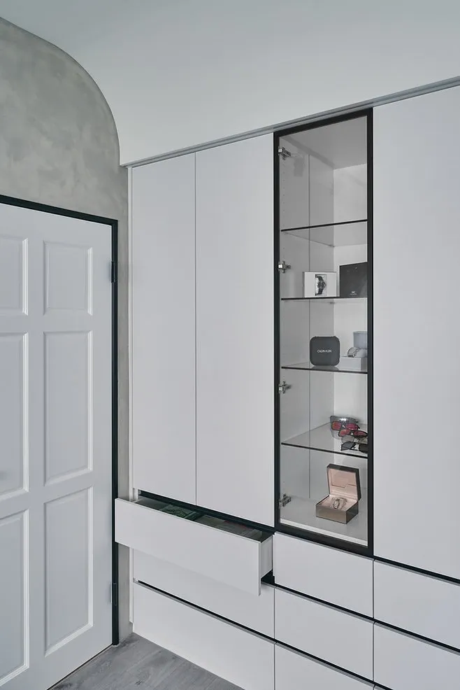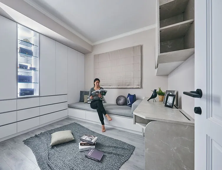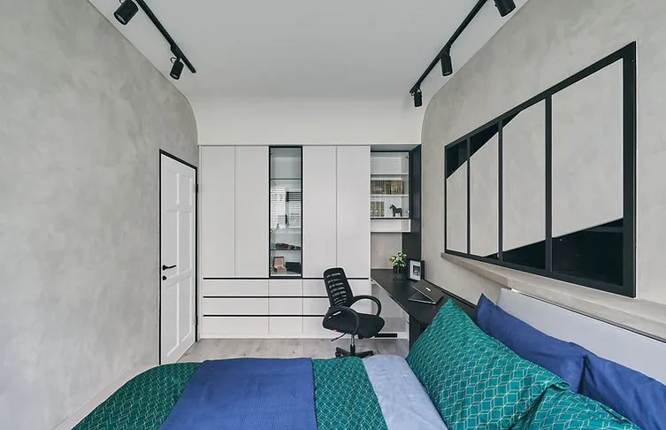 原本屋主兒子房間兩面牆各有一個窗戶,但考量到風水問題,周大將一個凸出的窗戶封閉,並將其改裝成收納櫃,不僅解決了風水問題,還增加了房間的儲物空間。