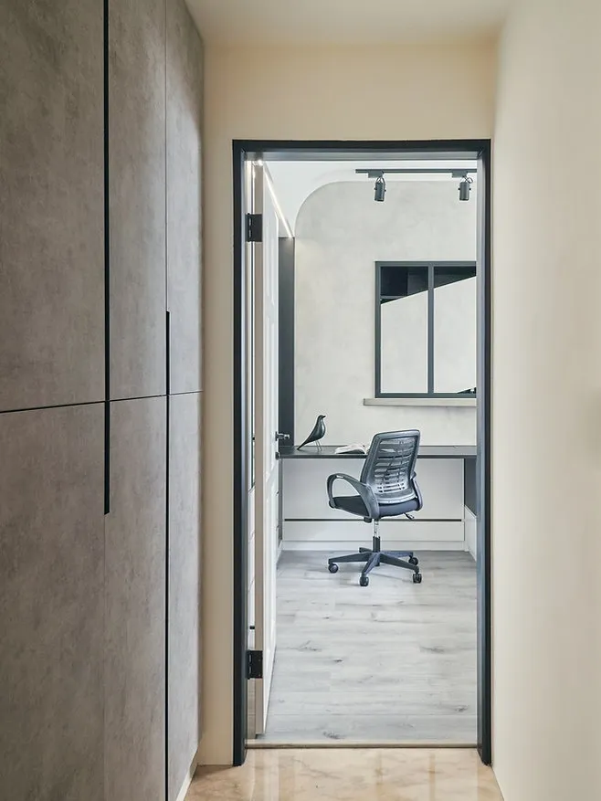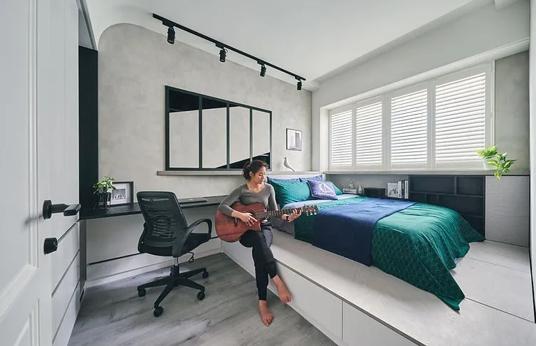 就讀大學的屋主兒子喜歡音樂,想在房間彈奏電吉他時更有個性及氛圍感,周大與之討論後,在房間上方安裝了一排射燈,除了營造獨特的氣氛外,也滿足屋主兒子的需求。