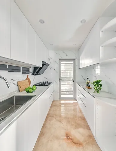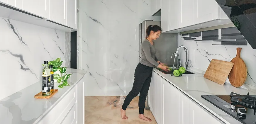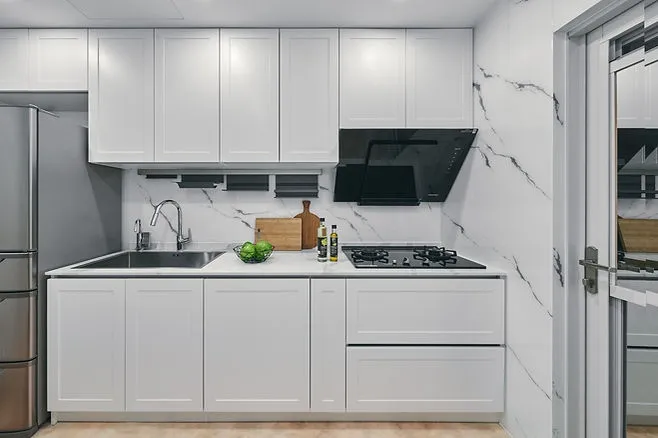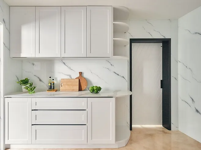 廚房的櫥櫃門板採用了陶瓷鋼烤技術,具有高硬度、霧面效果、不沾指紋等特點,耐刮易保養,可長期保持美觀。牆面則使用噴有大理石紋路的玻璃材質,增添了現代感的同時也易於清潔維護。