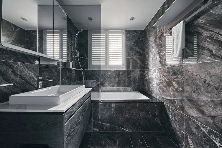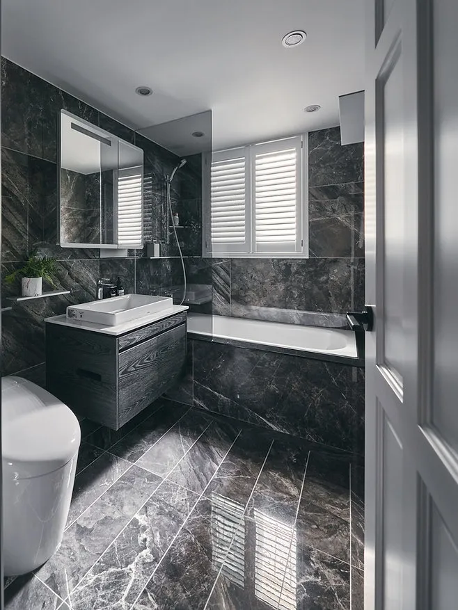 浴室則選擇深色的設計,增添現代感與沉穩氣息。牆面及地面貼上大理石紋磁磚,不僅美觀耐看,還強化了防水效果。