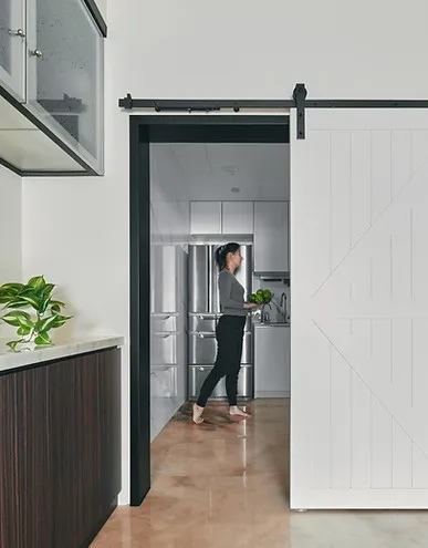 廚房門片採用兩種不同的設計,從廚房往餐廳看是造型門片,從餐廳往廚房看則設計成穀倉門的樣式,結合了女主人喜歡的美式風格,橫拉式的滑動門不僅節省了空間,也讓進出更加方便,既美觀又實用。