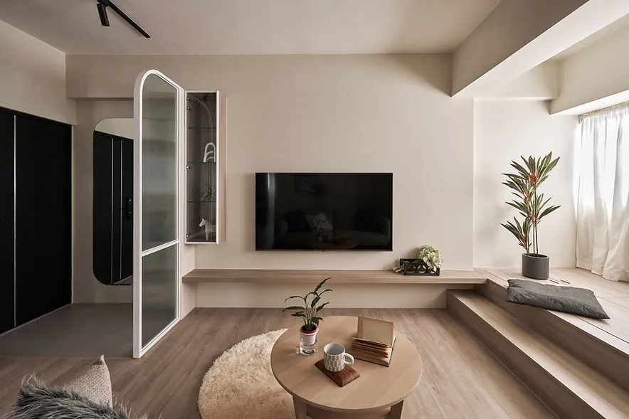 臥榻與電視櫃的高度設計一致,打造出整體空間的一致性和和諧感。這樣的設計不僅增強了視覺上的統一性,還提升了空間的整體美感。