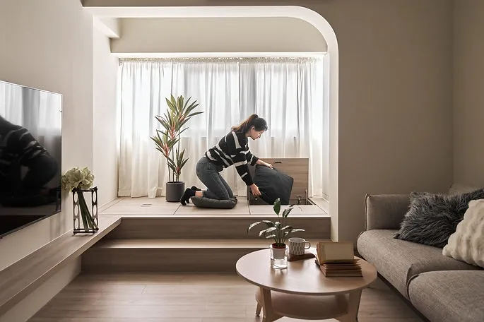 家最重要的功能之一就是提供一個紓壓的角落。身為上班族的屋主姊妹,下班後都習慣用瑜珈來放鬆身心。周大特別在陽台上設計了一個多功能的臥榻,不僅適合瑜珈練習,也提供了額外的儲物空間。讓這個區域不僅能夠作為放鬆身心的場所,也能有效收納生活物品。