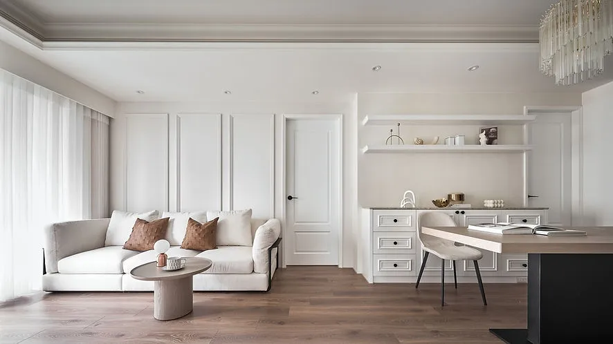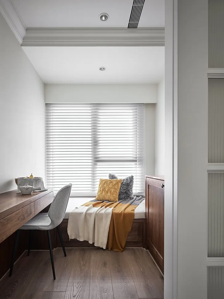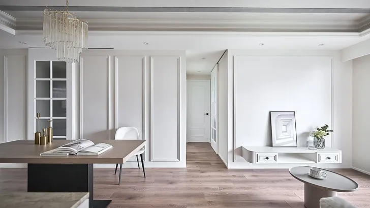 房屋天花板、牆面及家具都使用了線板裝飾,除了可以修飾直角外,也更加展現美式風格的典雅與細緻。