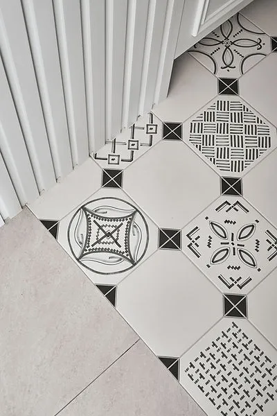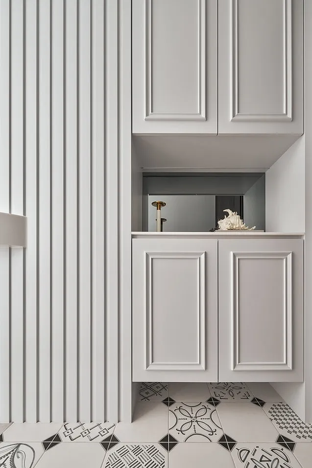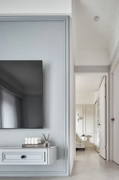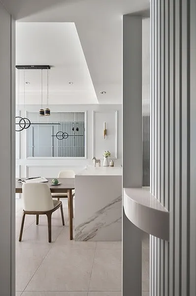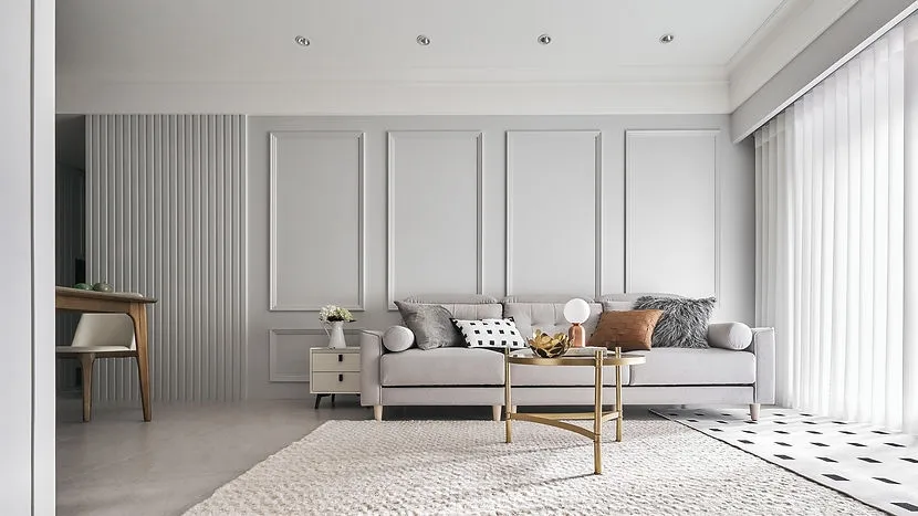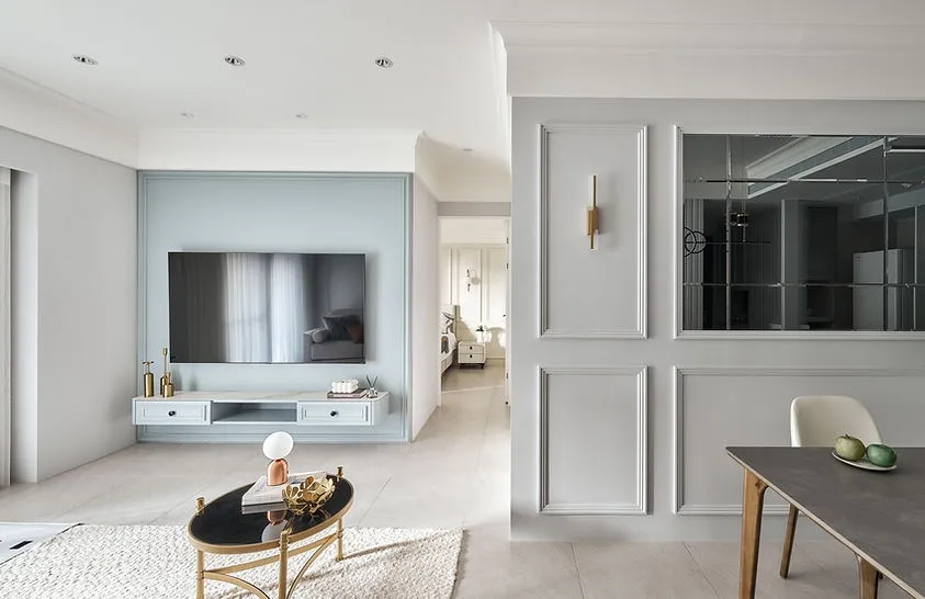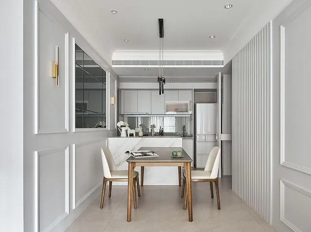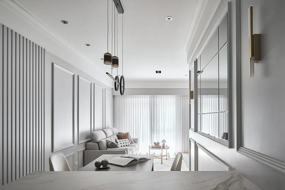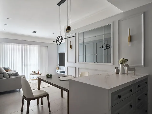 客廳與餐廳的牆面採用了簡約俐落的美式線板設計,並結合格柵的直線條設計,勾勒出空間的立體感,連續性的線板裝飾形成視覺延伸的效果,放大整體空間,相同款式、顏色的線板更為空間帶來一致性。