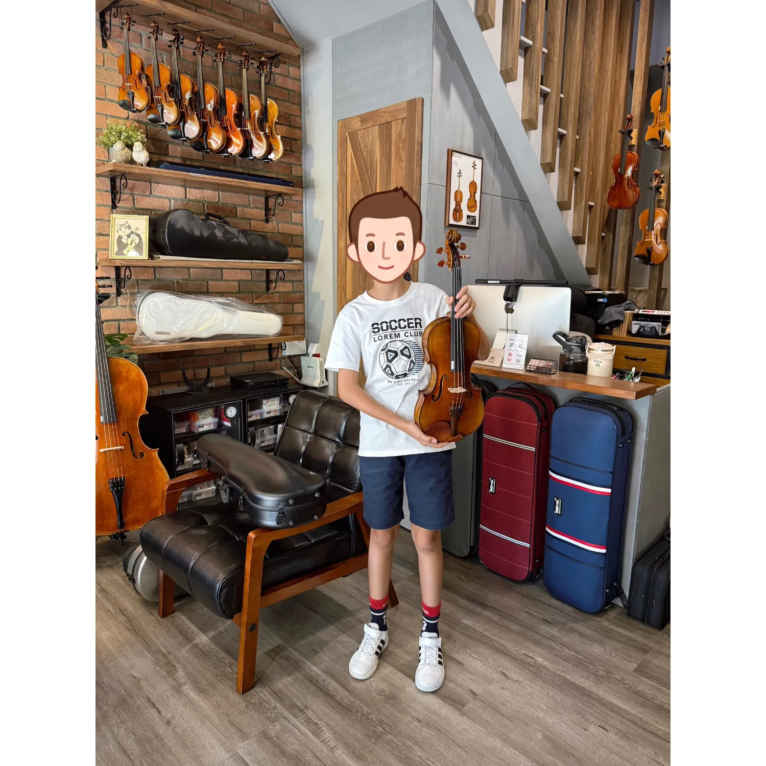 這次來店試拉了4~5把小提琴後,決定選購我們「首席獨奏系列」小提琴,嚴選3A級雲杉/楓木、自然乾燥5年、歐洲原料純天然半油性漆、大師仿古工藝,弟弟反覆測試就喜歡這把的高低音共鳴與balance,搭配活動給了非常優惠的價格,也期待這把提琴能陪伴他在音樂路上繼續成長~
