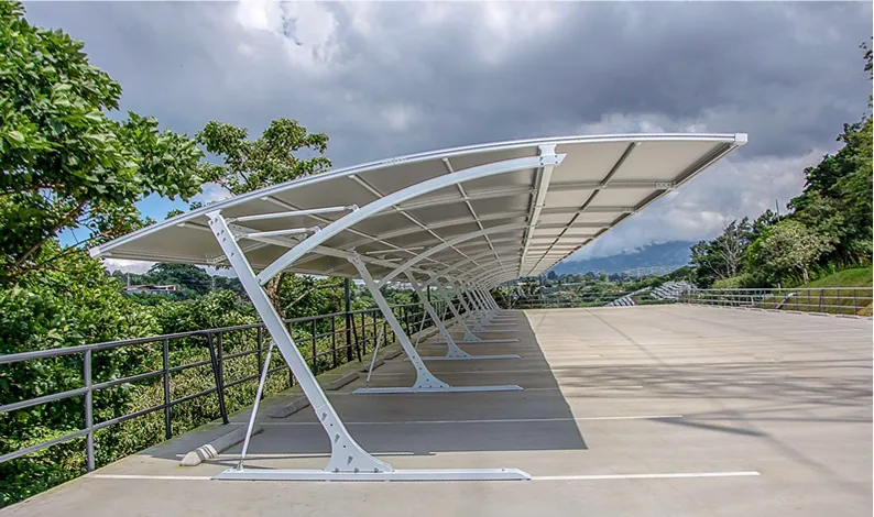 天幕車篷結合 熱浸鋼材靜電噴塗 (HDG electrostatic spray) 與 PVDF 膜材料,不僅堅固耐用,更能兼具設計美感,成為許多人搜尋 停車棚推薦 時的首選。