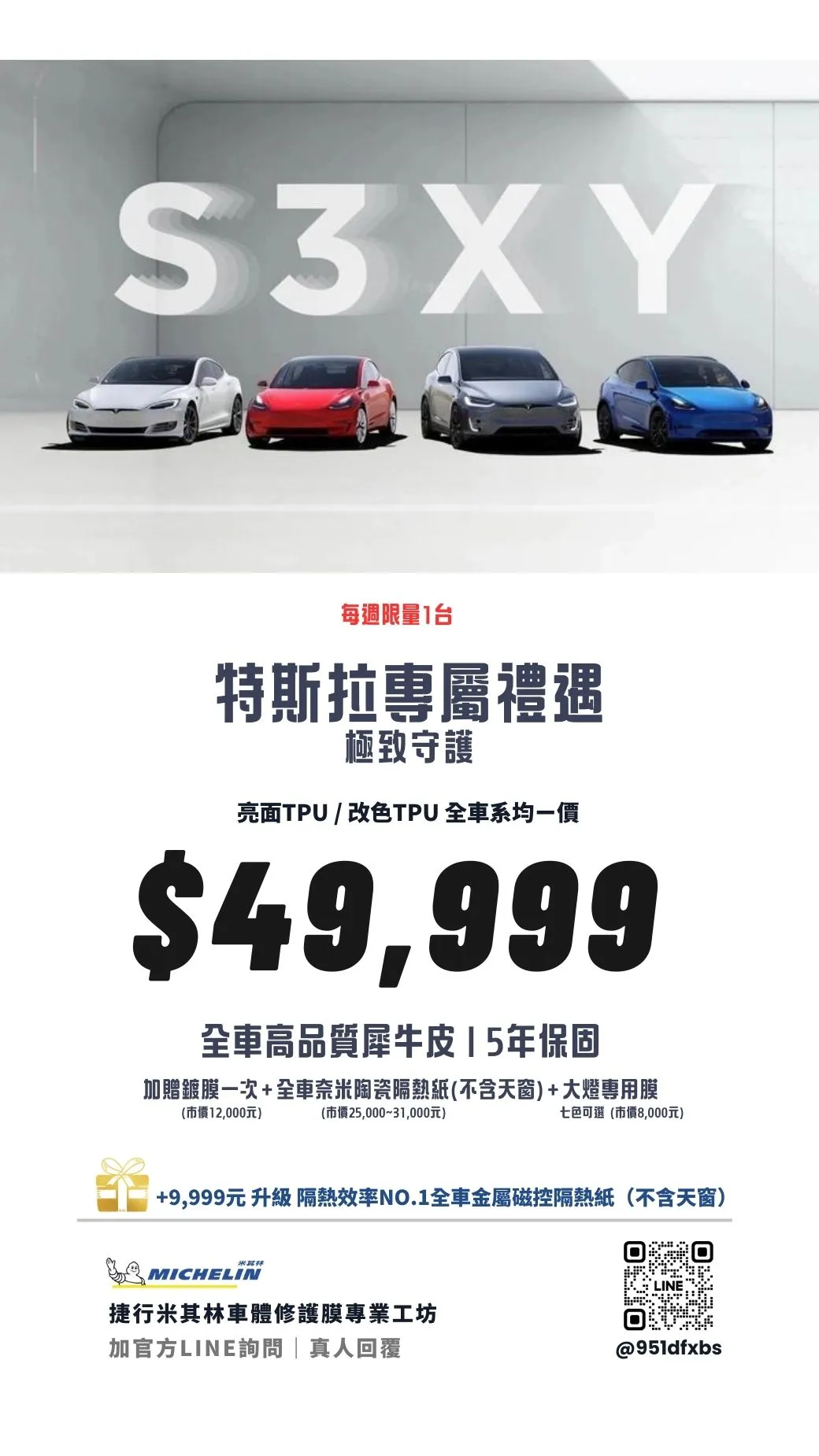 特斯拉車主專屬・每月限量 1 台|NT$49,999 全車極致守護