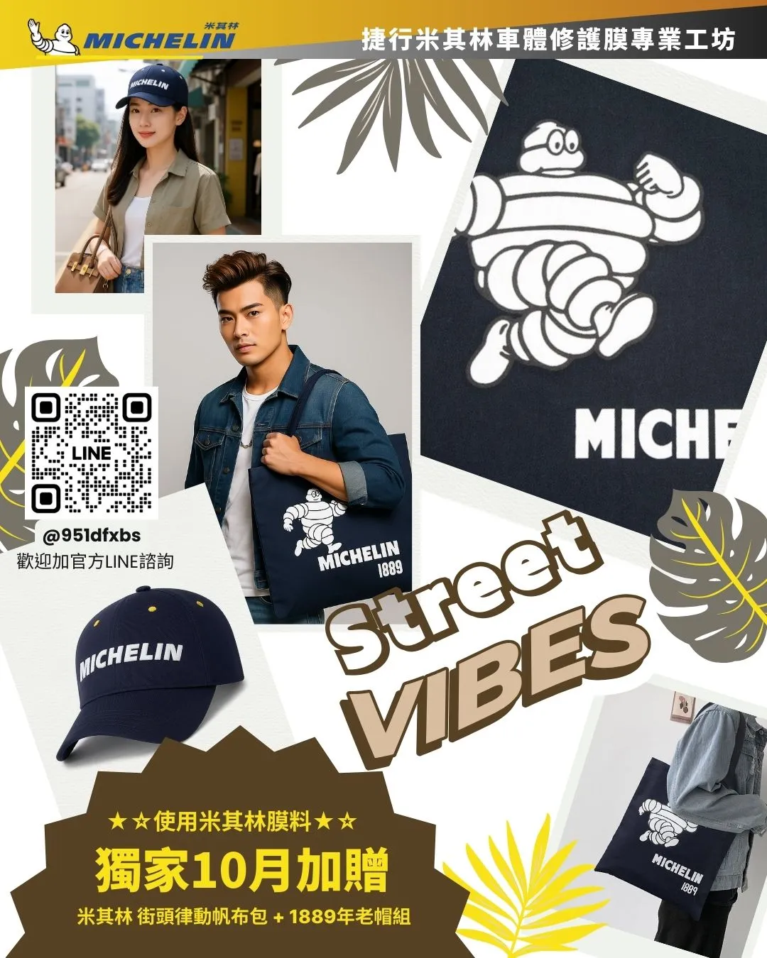 凡預約米其林膜料施工即贈「米其林街頭律動帆布包 + 1889年限定老帽組」!