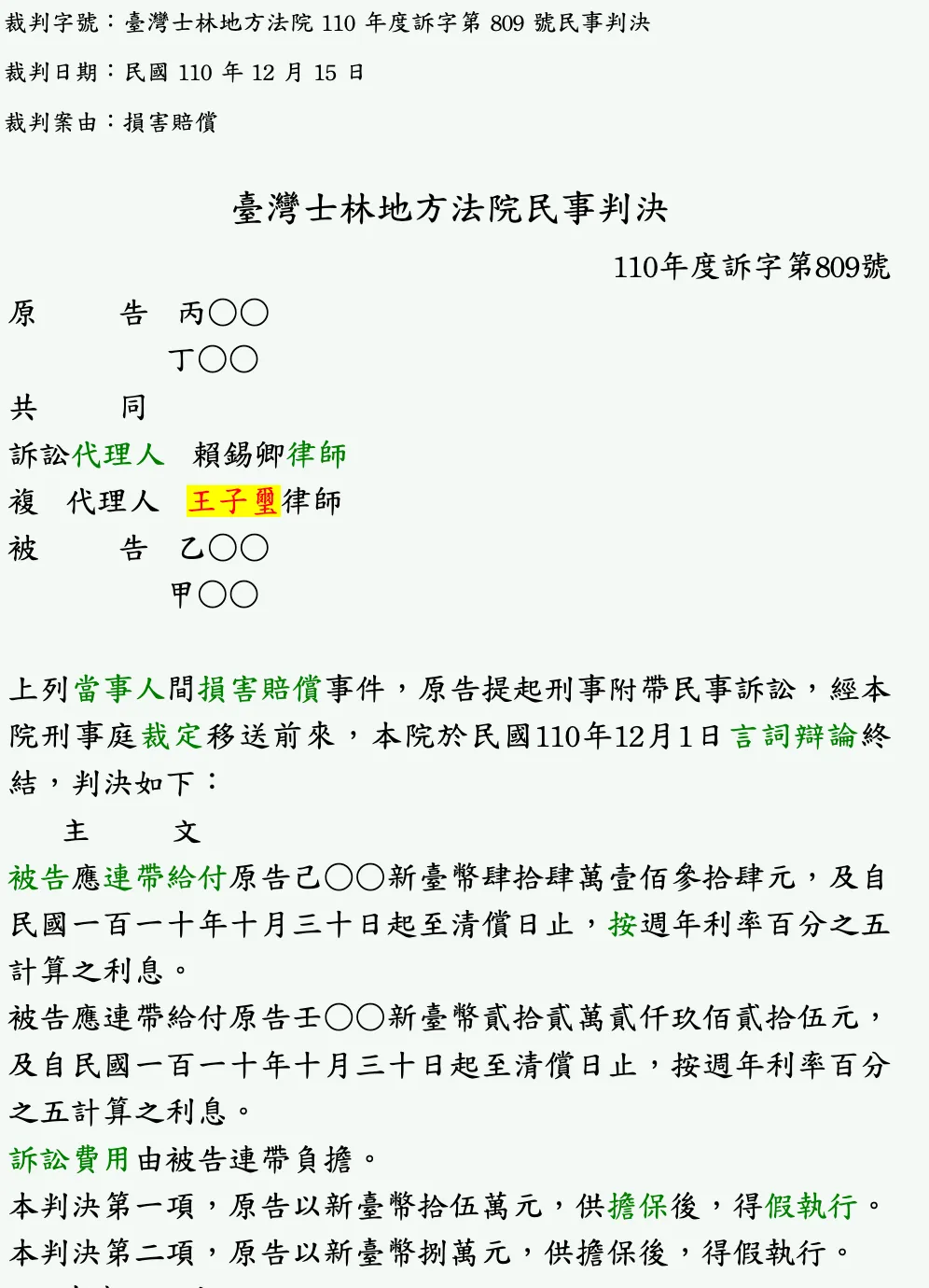 民事_丙○○_損害賠償獲勝