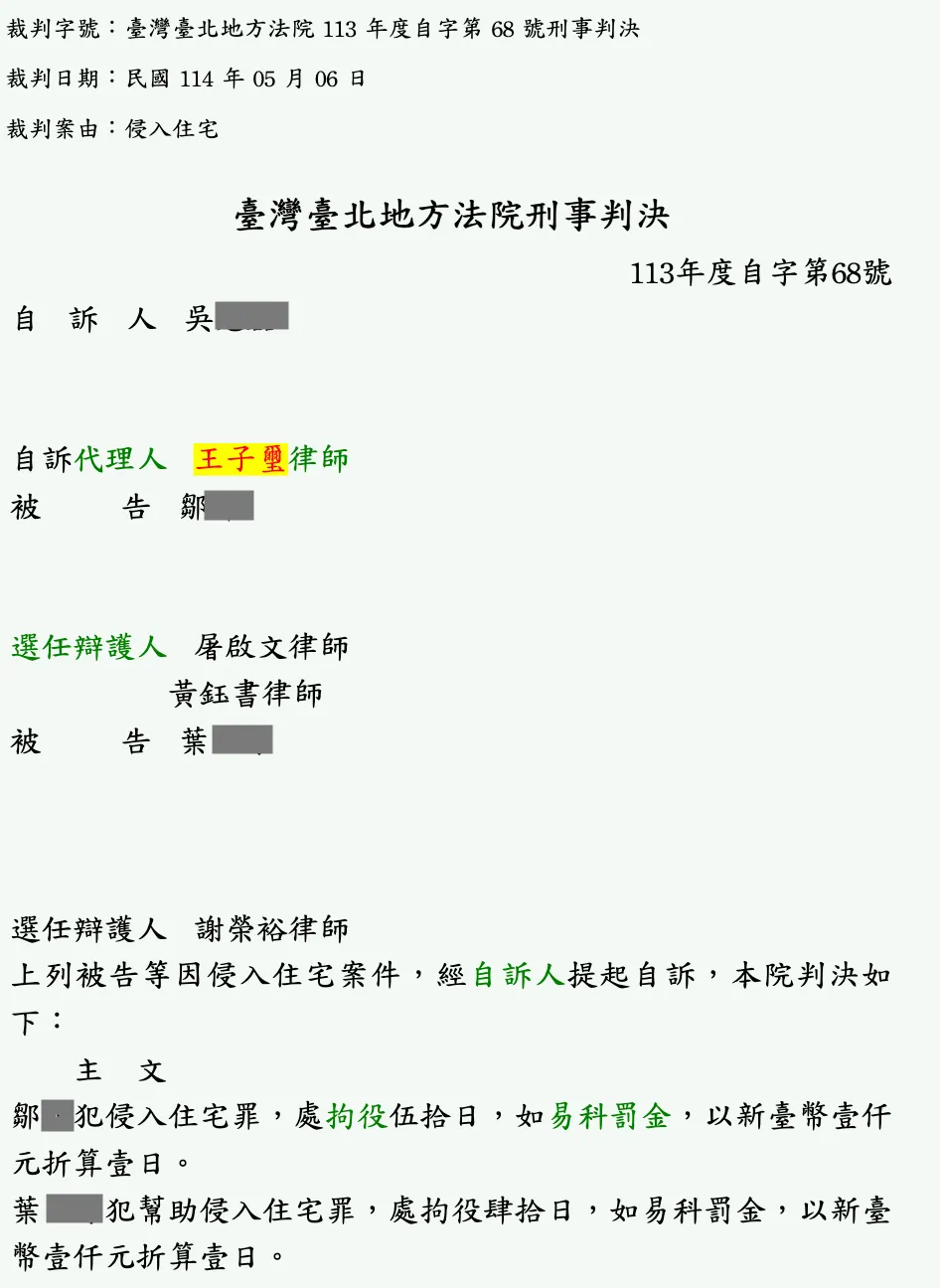 刑事_吳○○_侵害住宅自訴成功