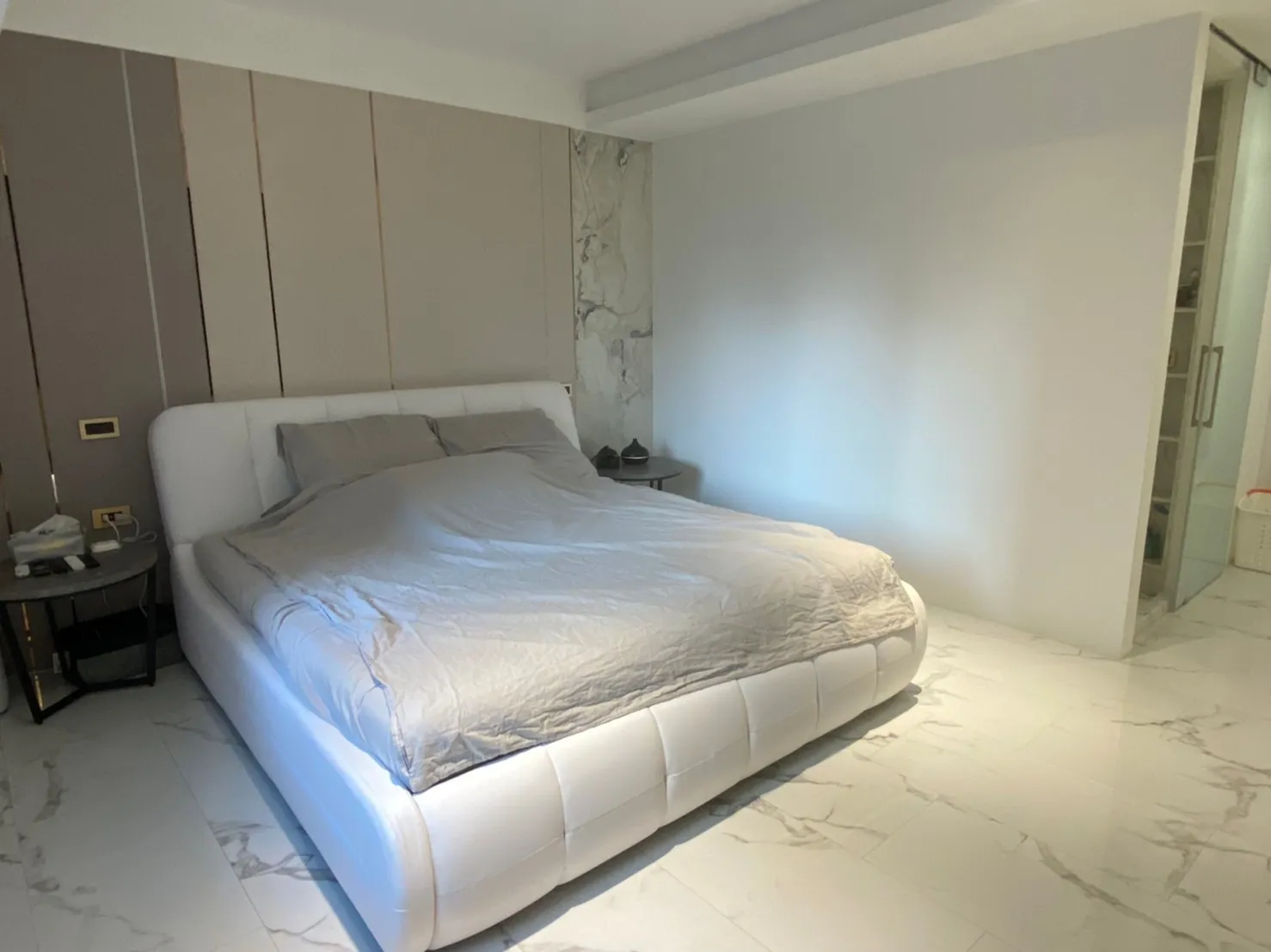 主臥以大理石紋地坪與灰階色系為基調,床頭牆結合布料、石材與金屬線條,低調中帶出層次感。