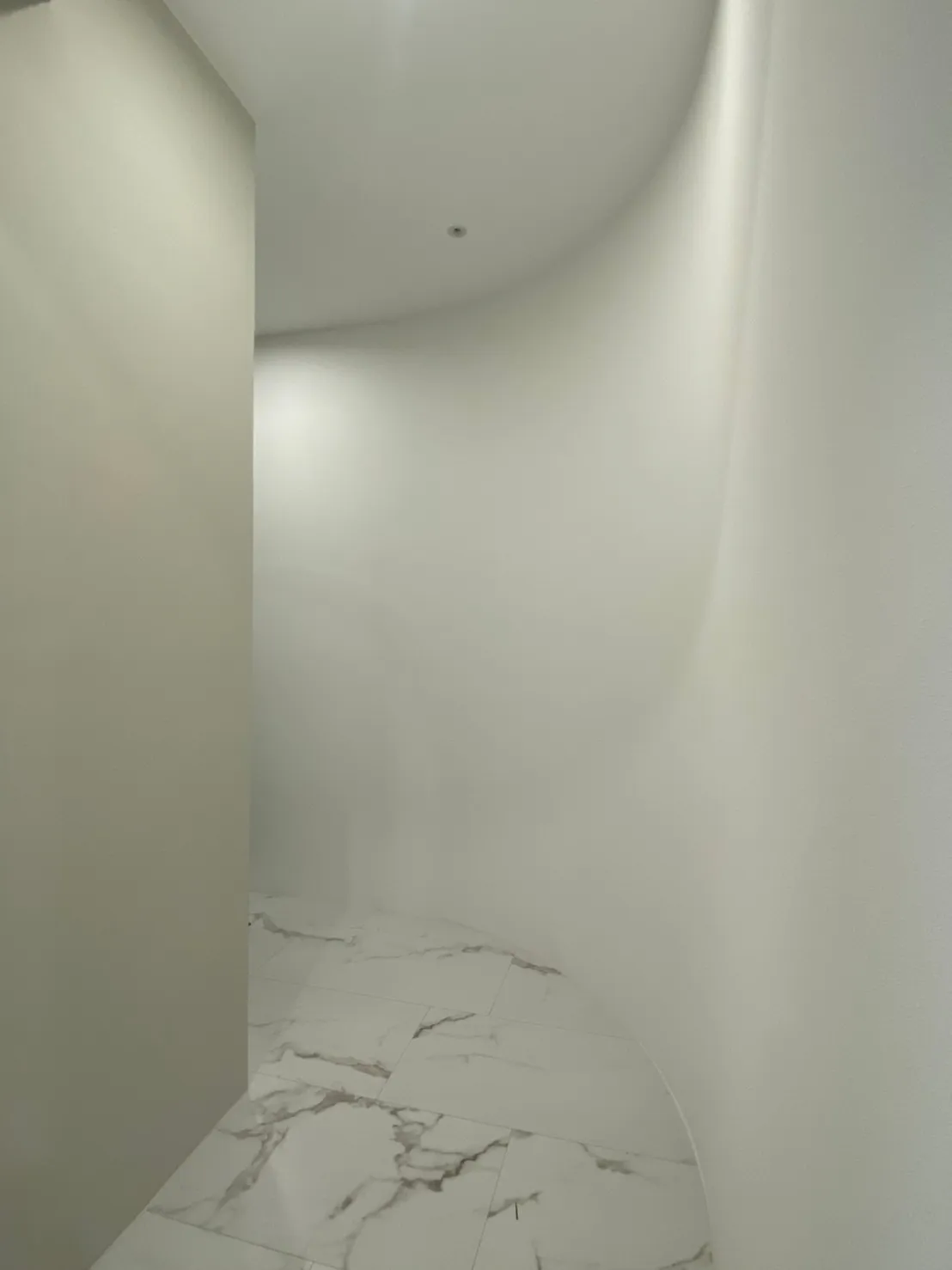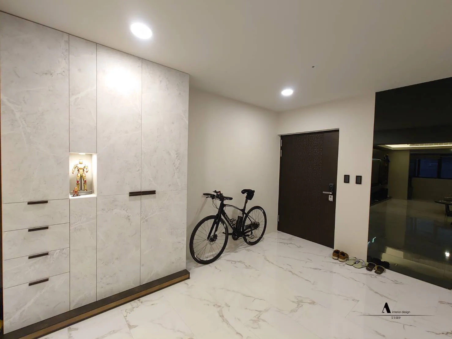 利用弧形牆面的特殊工法,突破一般直角設計,讓動線更柔和流暢。搭配大理石紋地坪,不僅考驗施工精度,也成為空間裡獨特的設計亮點。