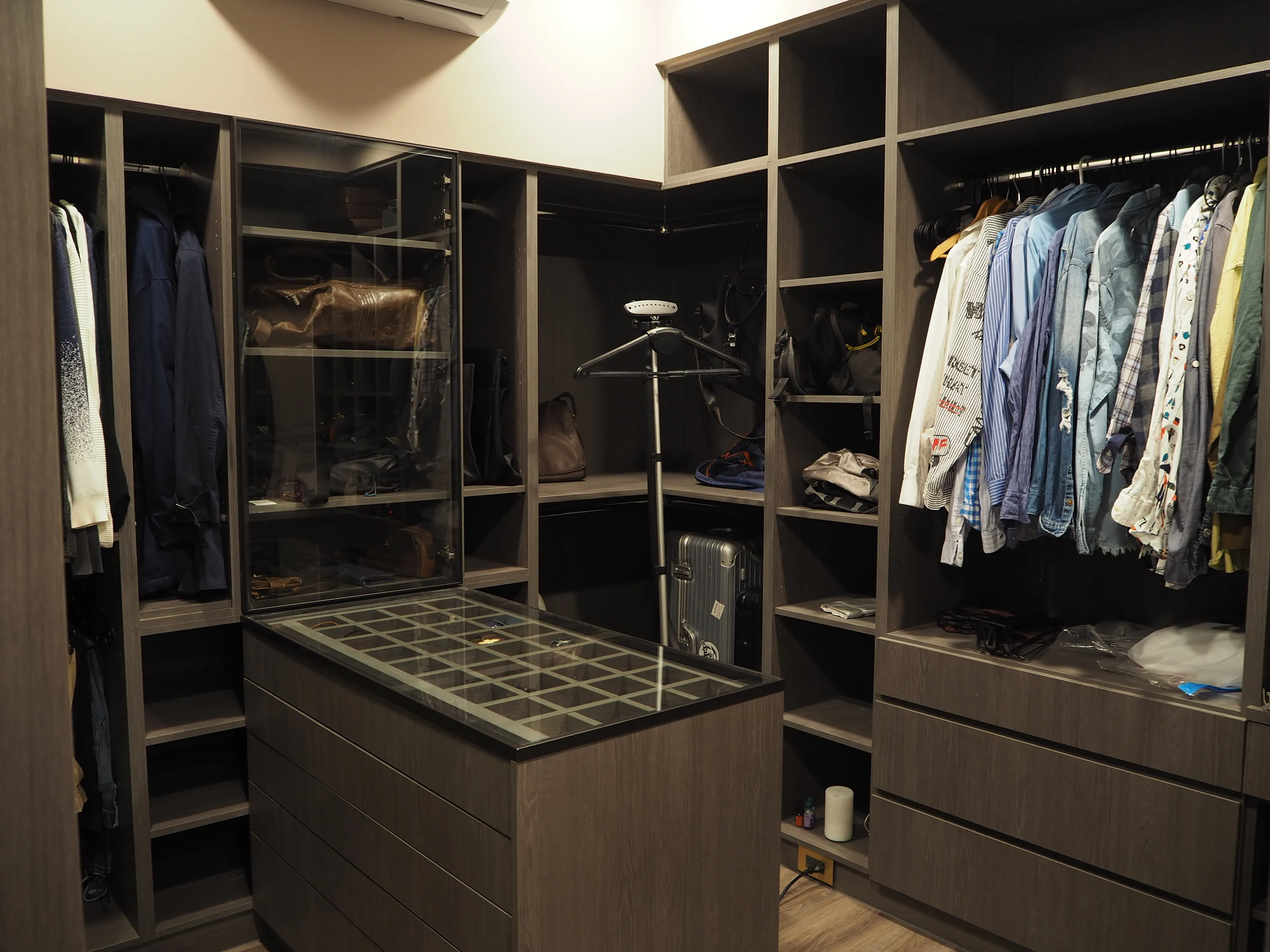 中央的玻璃展示島,將配件、飾品、皮帶與手錶清楚分格,收納一目了然,也讓每天的穿搭選擇多了一份儀式感。
