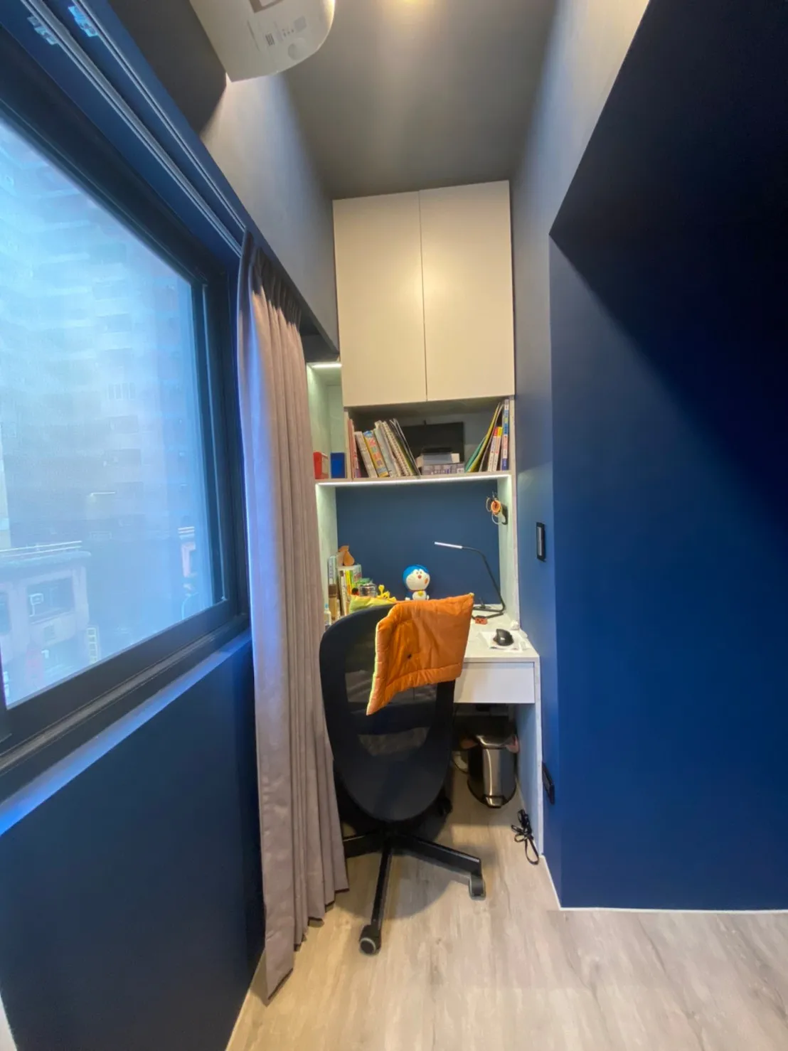 房內延伸出一個小型工作角落,利用靠窗的自然光與嵌入式收納,讓閱讀與辦公更加專注舒適。這樣的設計,不僅滿足了臥室的休憩功能,也兼顧了生活的多樣性。