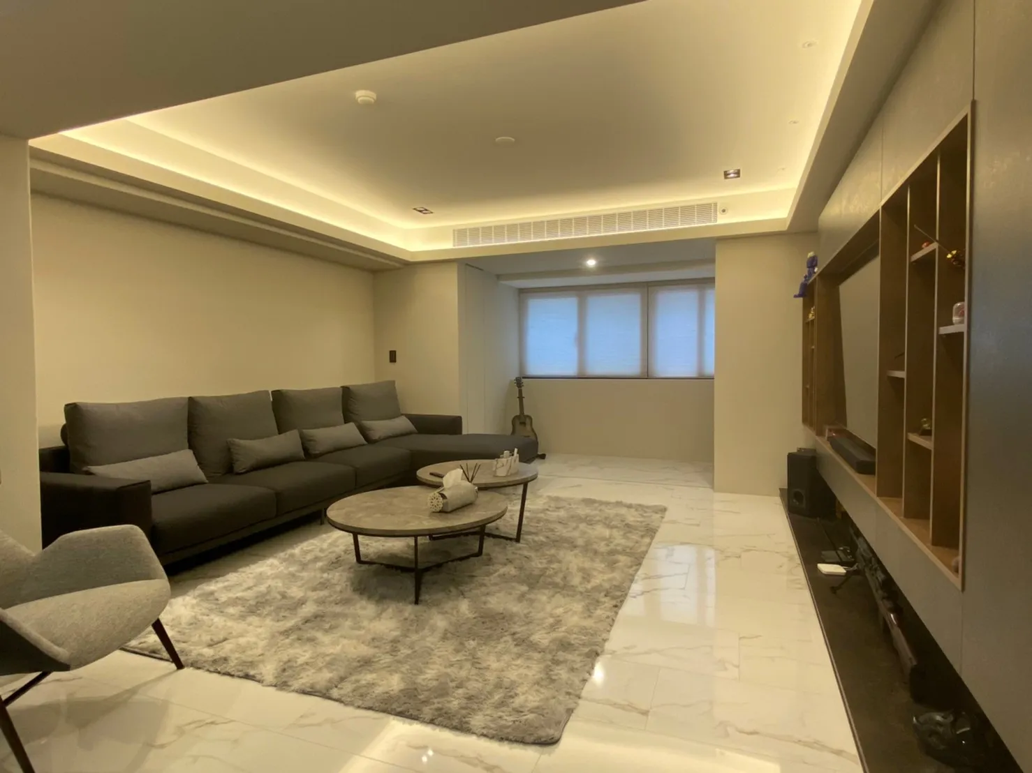 整體空間以沉穩的灰色調為基底,搭配大理石紋地坪與線性間接照明,營造大器卻不壓迫的氛圍。