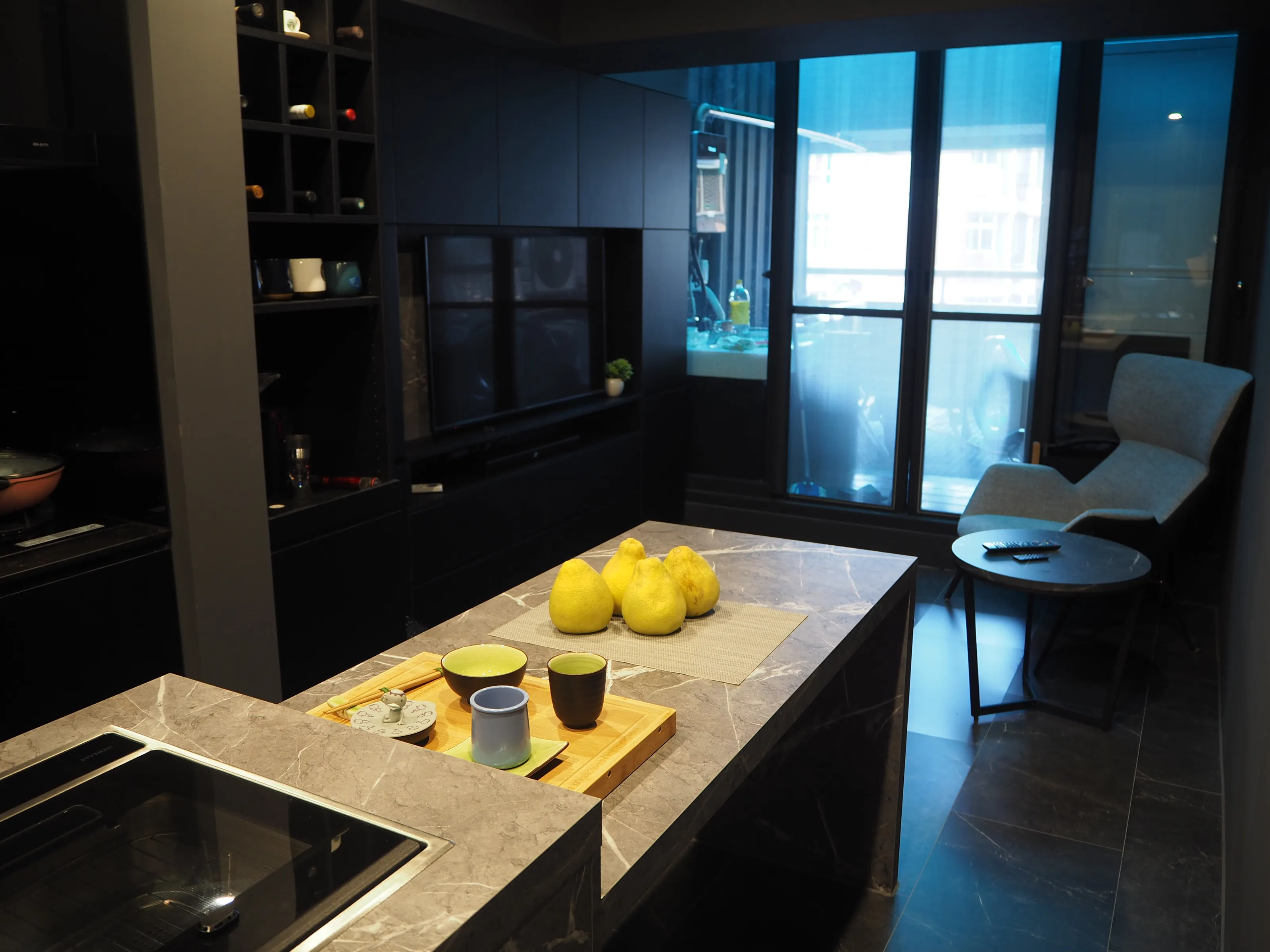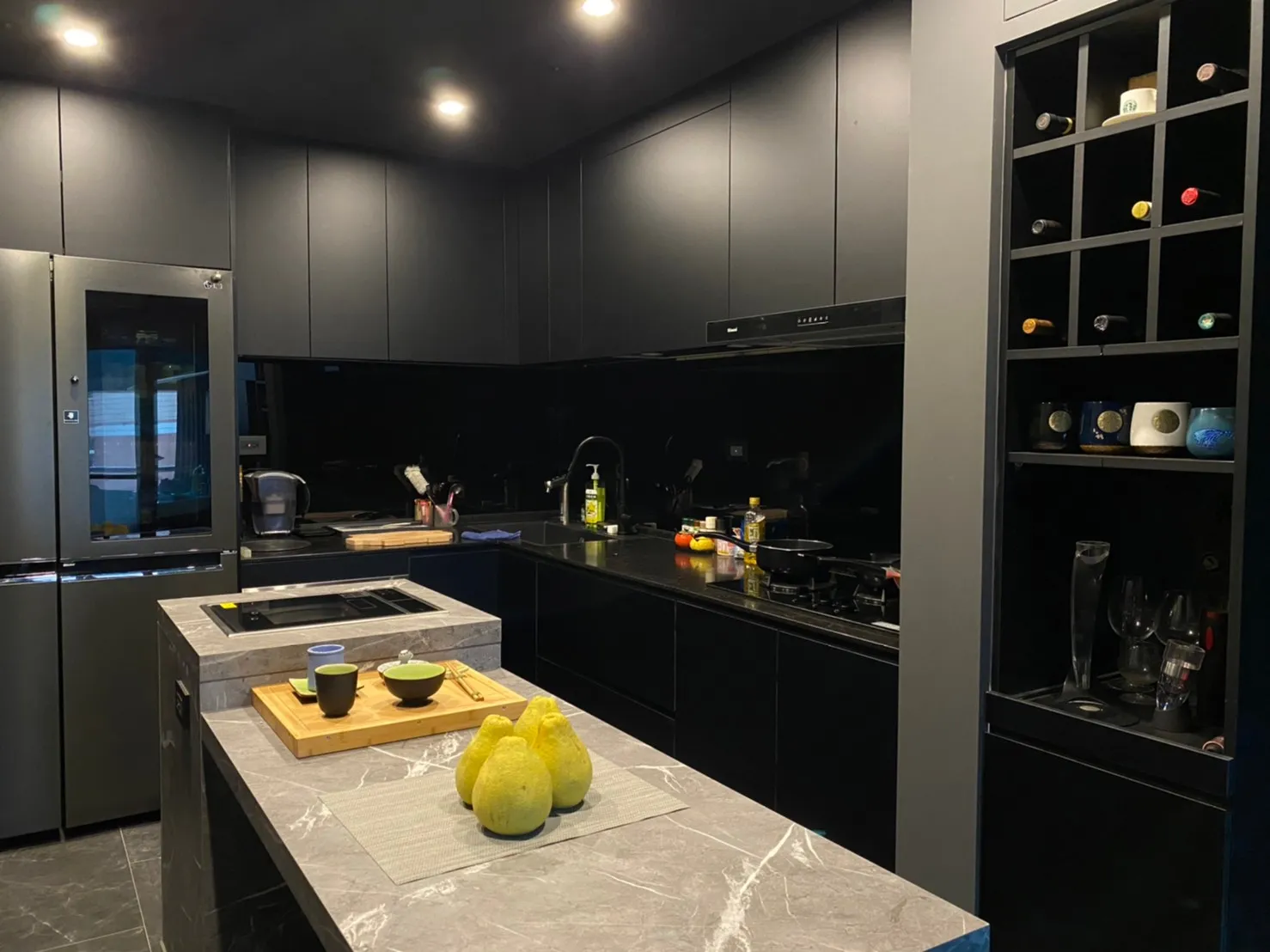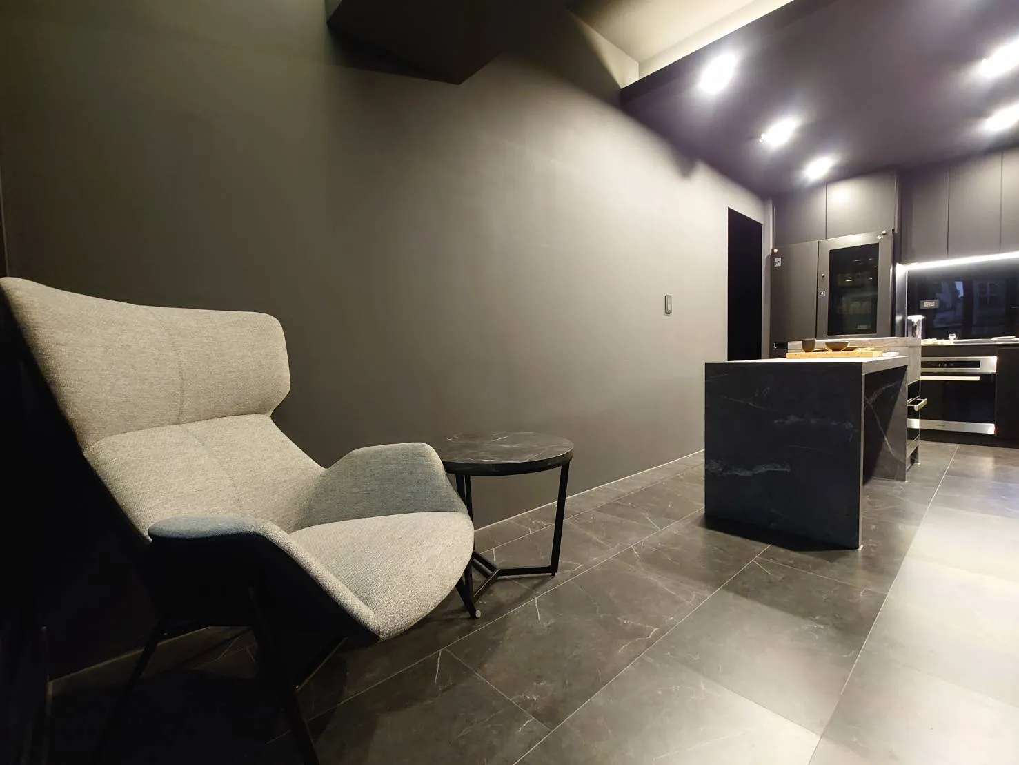 全黑色系搭配灰紋大理石中島,展現俐落與質感。中島延伸規劃休憩區,讓料理、交流與放鬆自然串連。收納完整、酒架精緻,讓空間既實用又有生活品味。