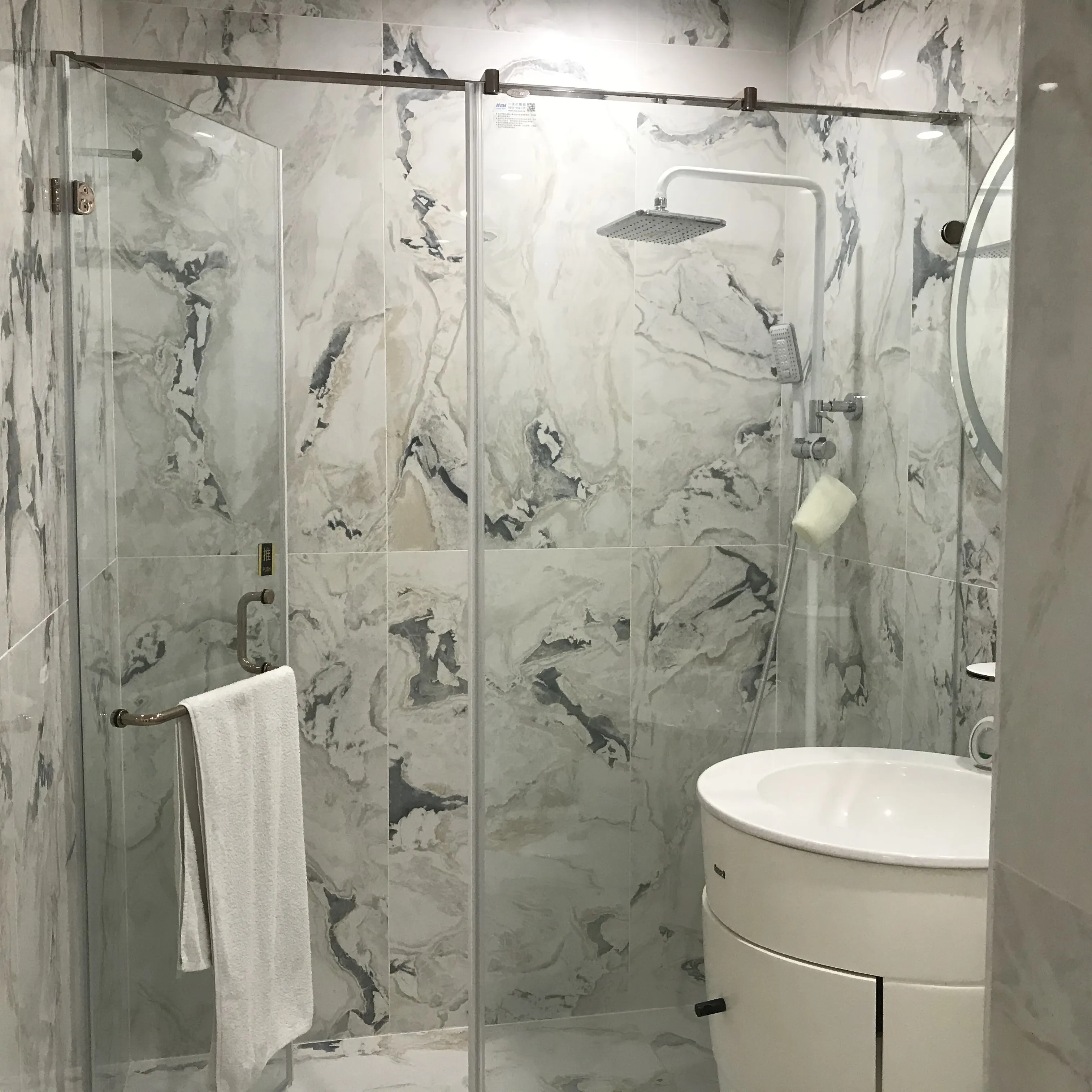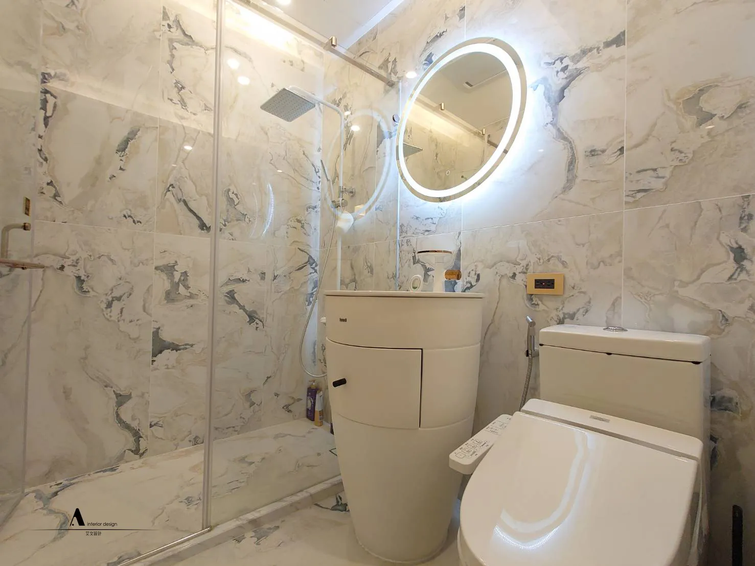 白色衛浴間以大理石紋理搭配圓形背光鏡,明亮純淨,讓日常洗浴更顯清爽舒心。