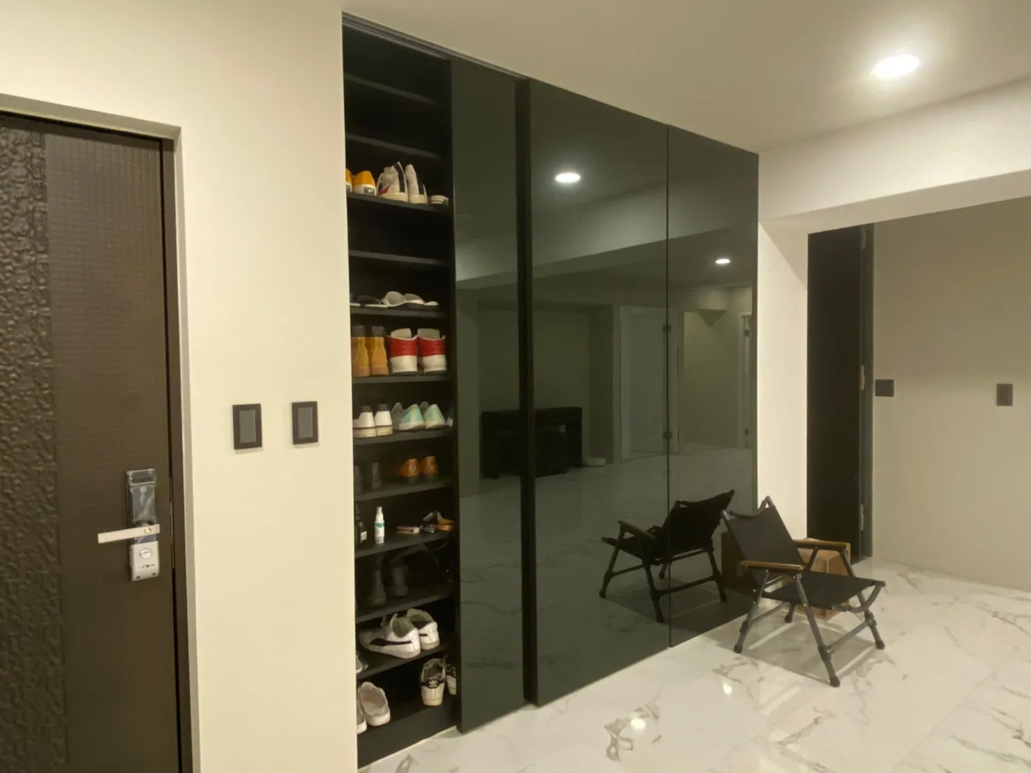 走進家門,第一眼便能感受到秩序與質感。鞋櫃以大容量規劃,滿足收納需求,黑色玻璃與白色石紋兩種設計形式,展現不同氛圍。前者低調洗鍊,後者明亮大方,皆讓空間在整潔中保有獨特個性。