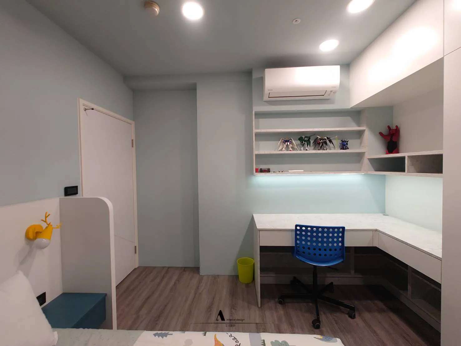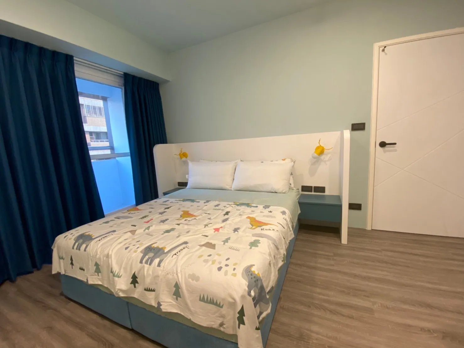 臥房以清爽藍色為主調,搭配木地板,營造舒適氛圍。