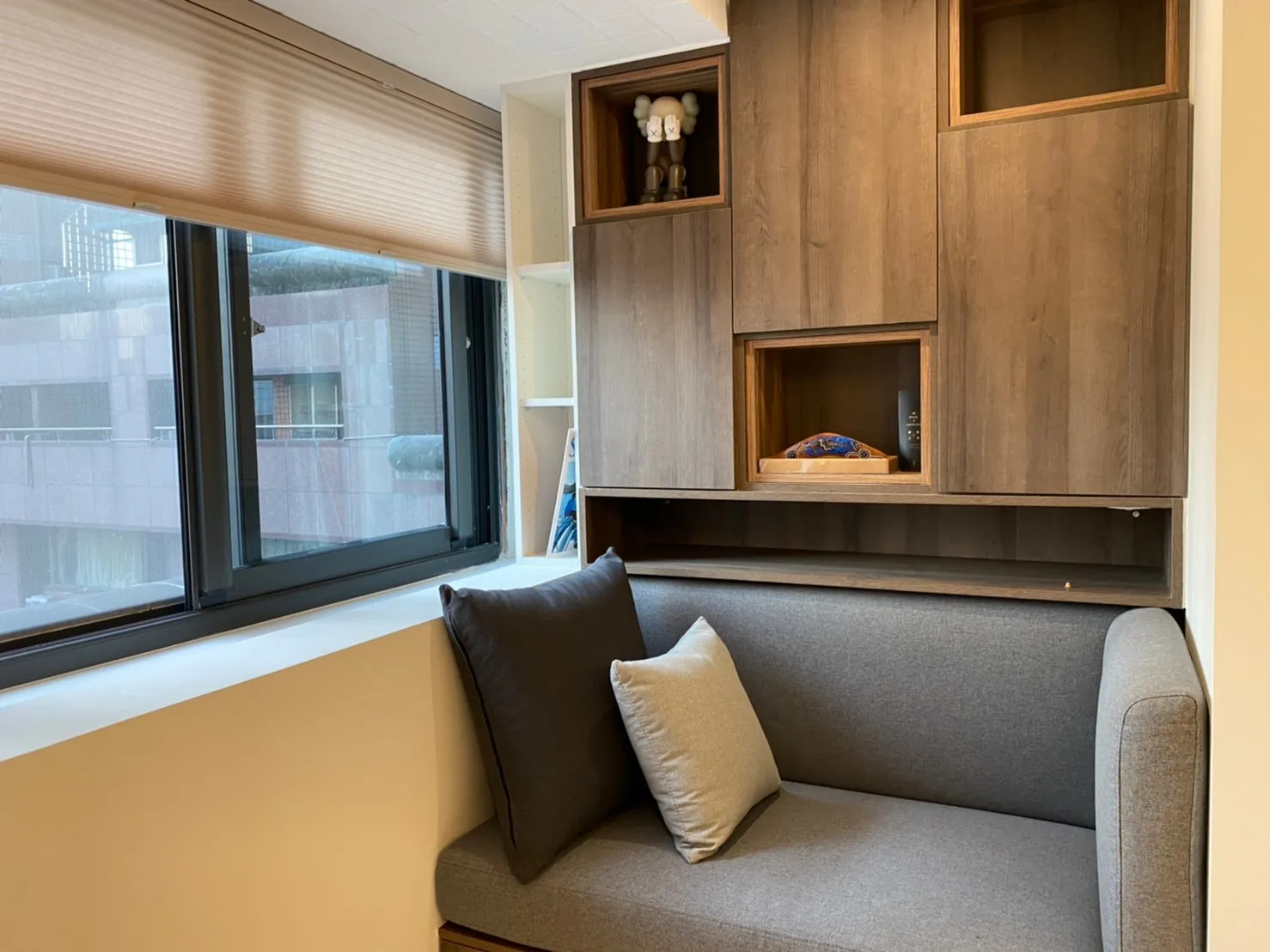 靠窗角落設置了臥榻與小型櫃體,結合收納與休憩機能。