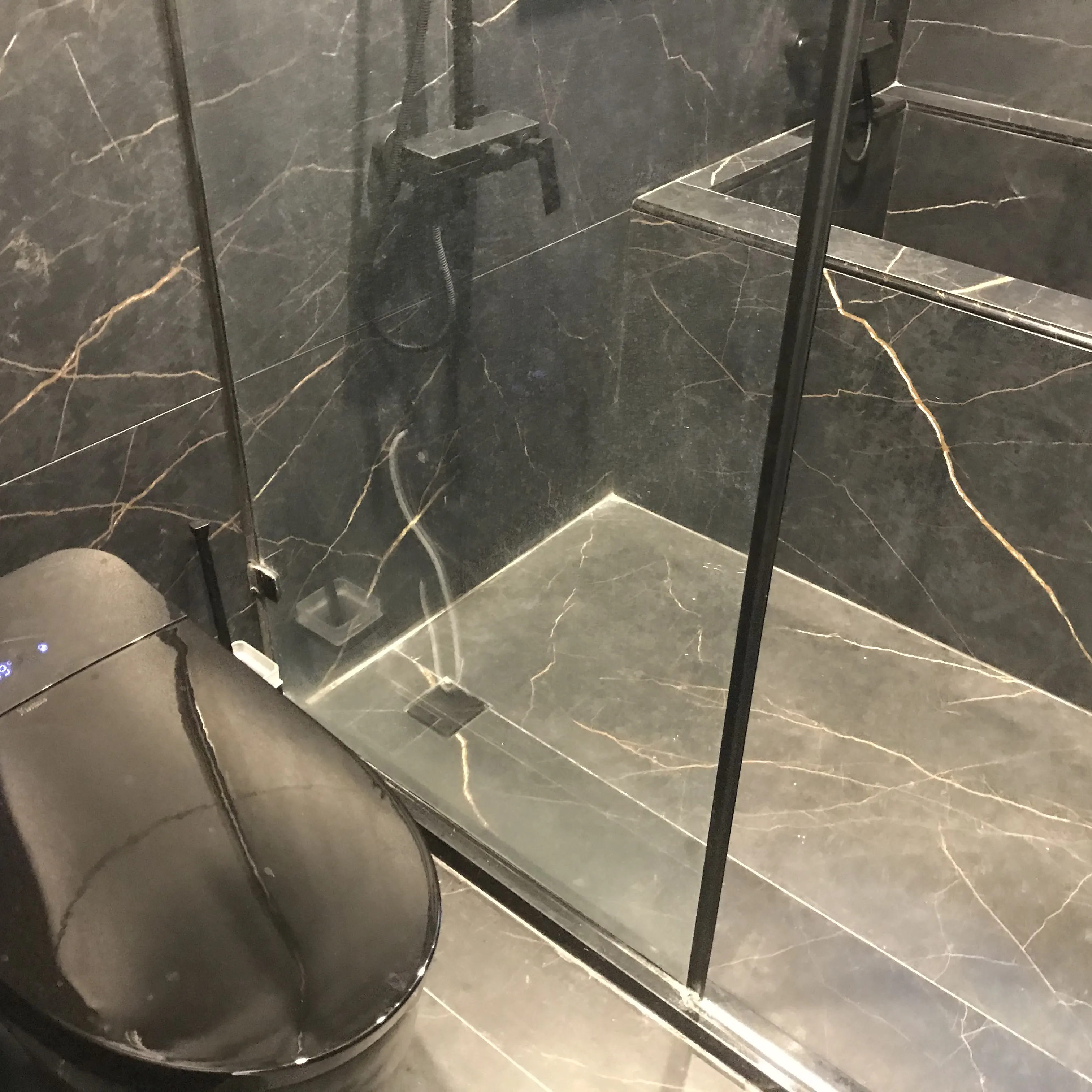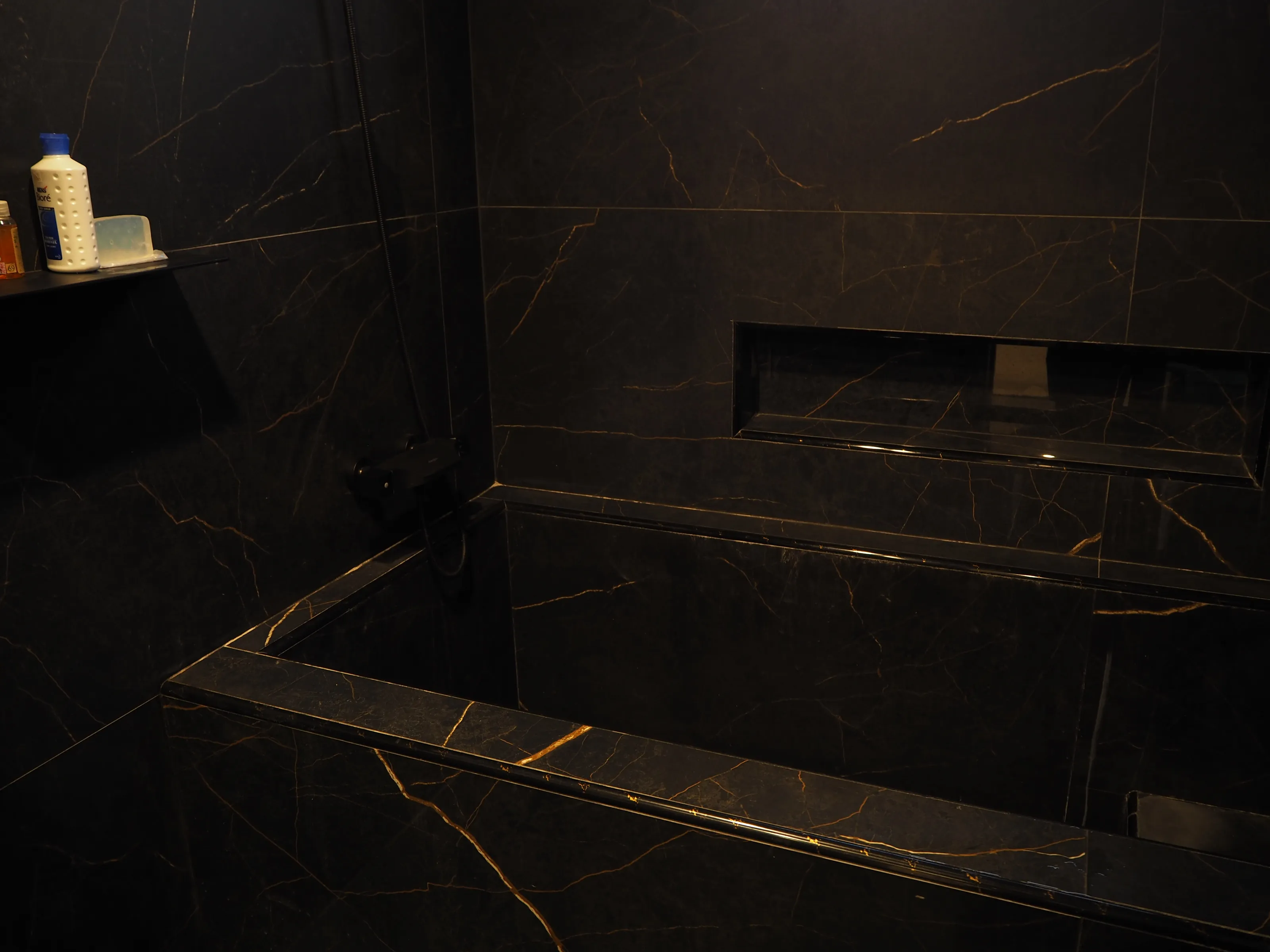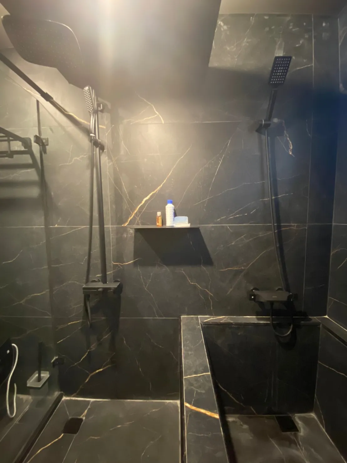 黑色衛浴間則選用深色石材與黑色衛浴設備,展現沉穩大器的氛圍,帶來宛如精品飯店般的體驗。