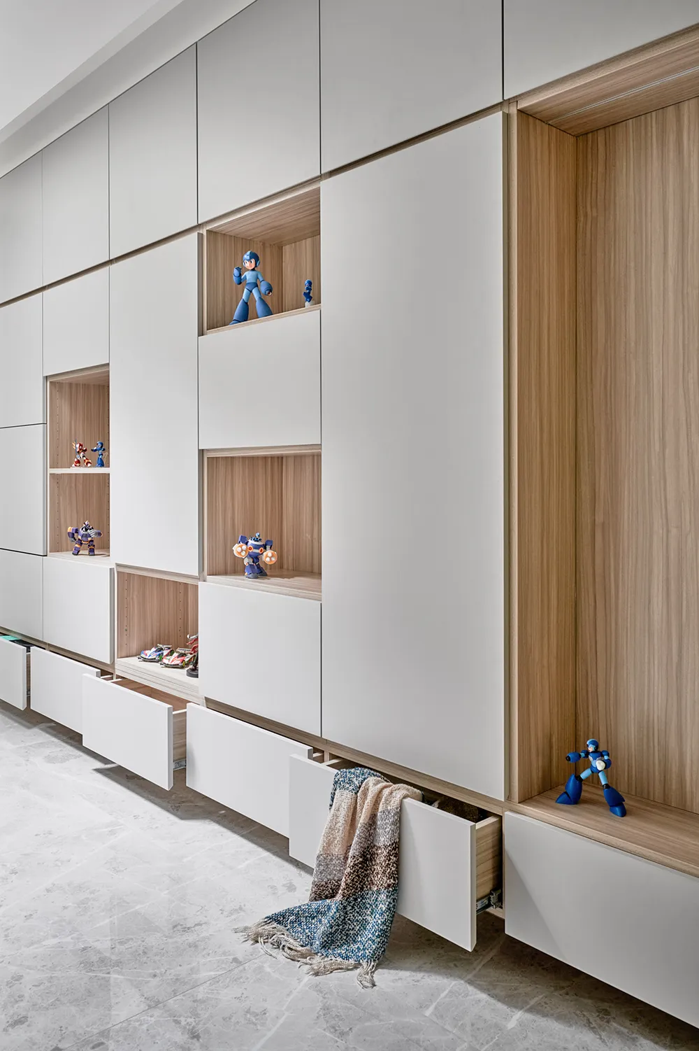 隨著步伐,則見由系統櫃體,構築親暱密碼立面,延展公領域形貌,在獨特風格與收納機能兩全之下,使家景逐步清晰。