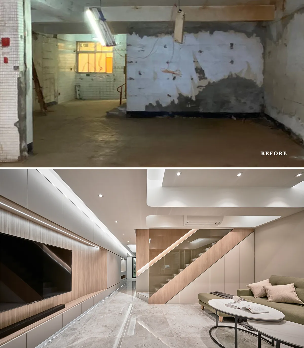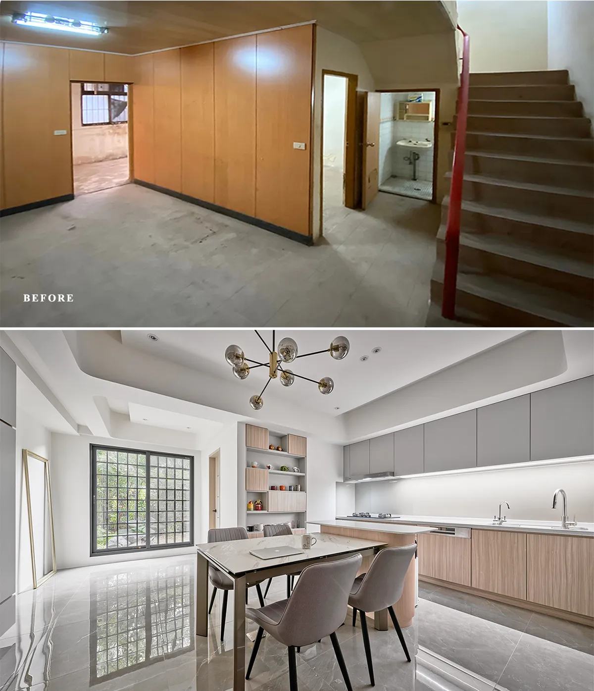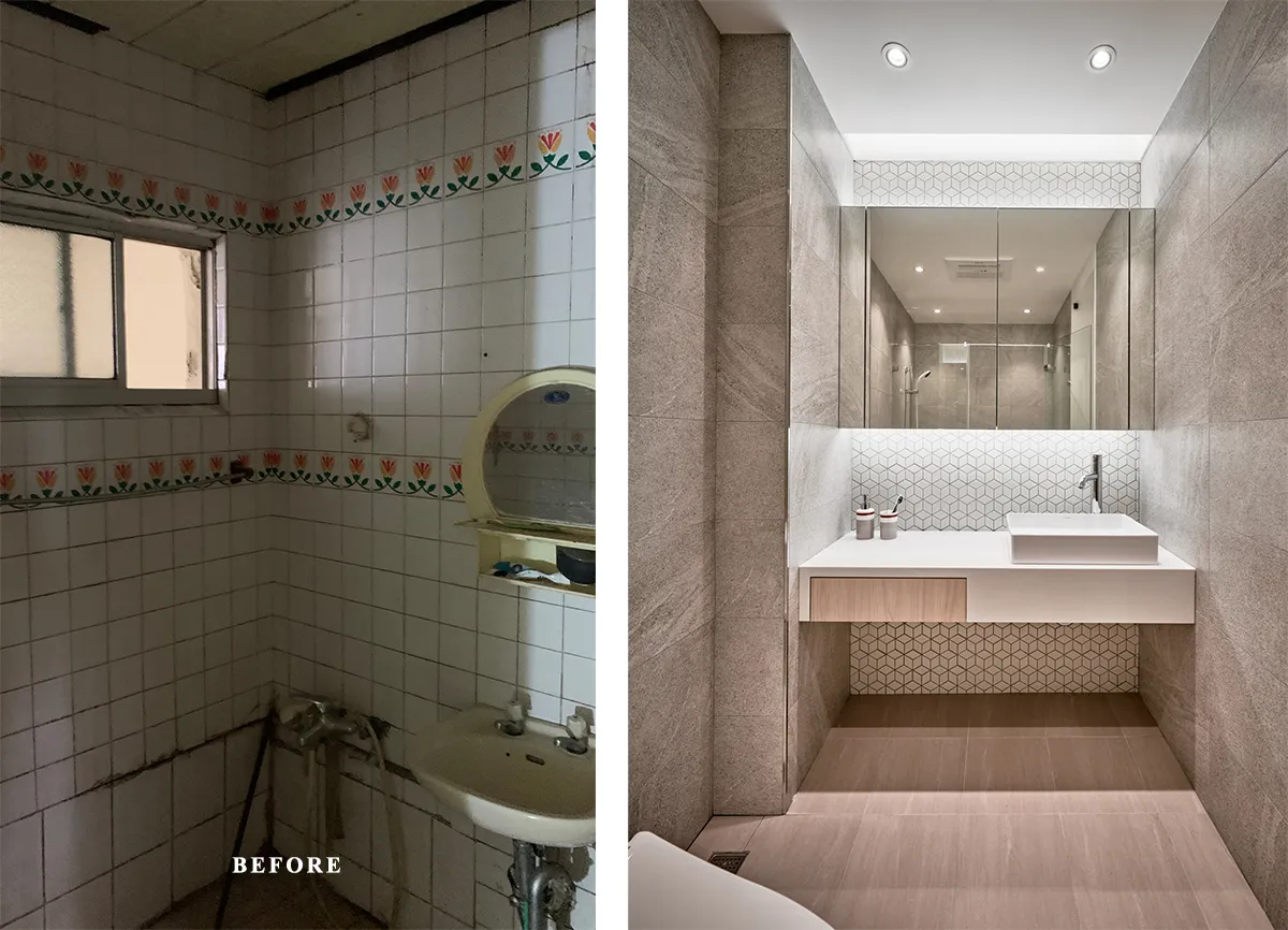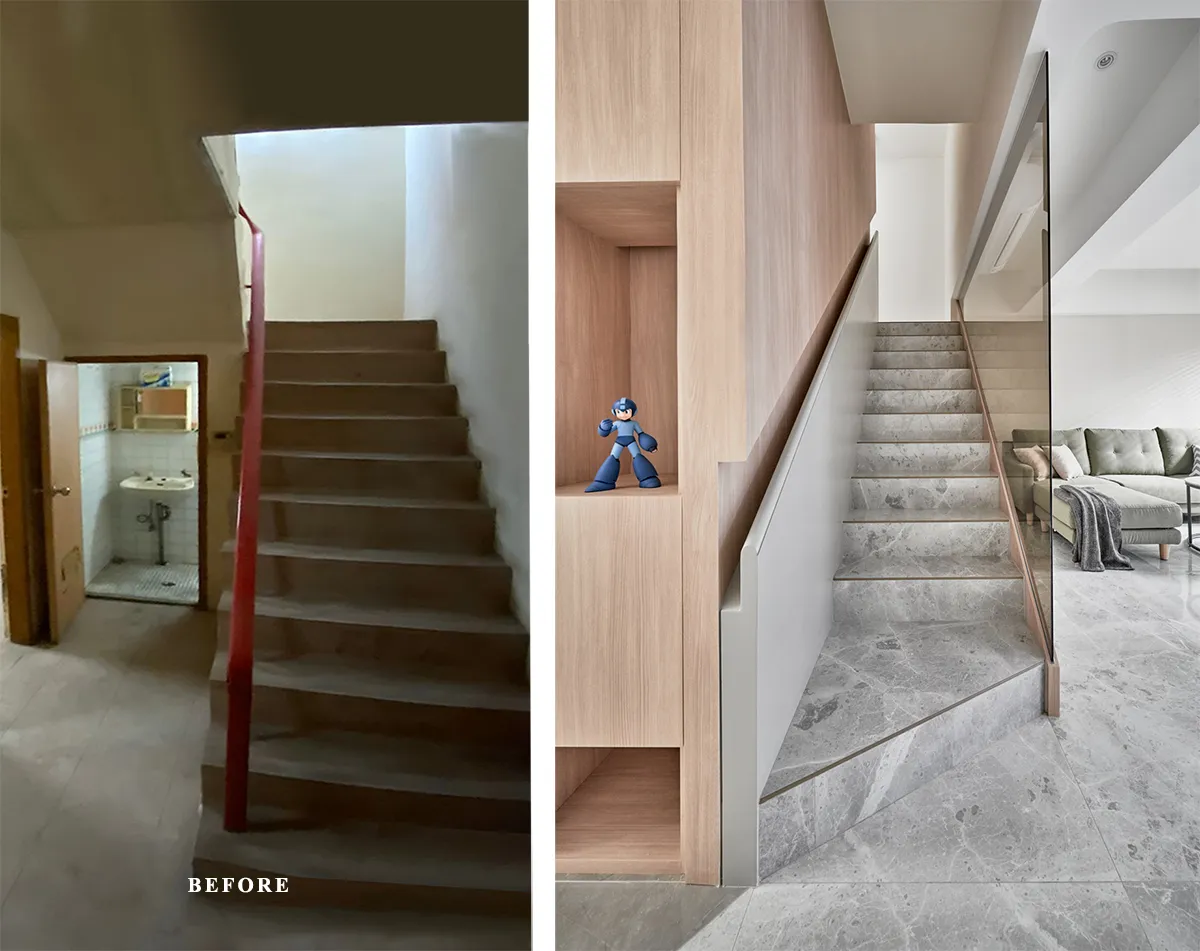 本案是屋主新婚成家之宅,考量未來將與夫妻倆,從新婚邁入育兒階段,甚至共伴小家庭長達 10 餘年、20 餘年光景,除了壁癌、漏水、基礎結構補強之外,亦重新審視公共管道,將老屋內梯下方浴廁調配新位置,降低不通風產生異味。