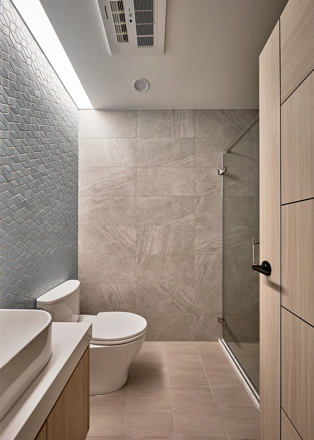 同樣以灰色為主調,揀選高釉仿石材磚拼貼,在上方燈帶照射之下,更顯立體感,主牆放大視覺延伸性,使得小坪數切分為乾濕區,仍不顯侷促感。