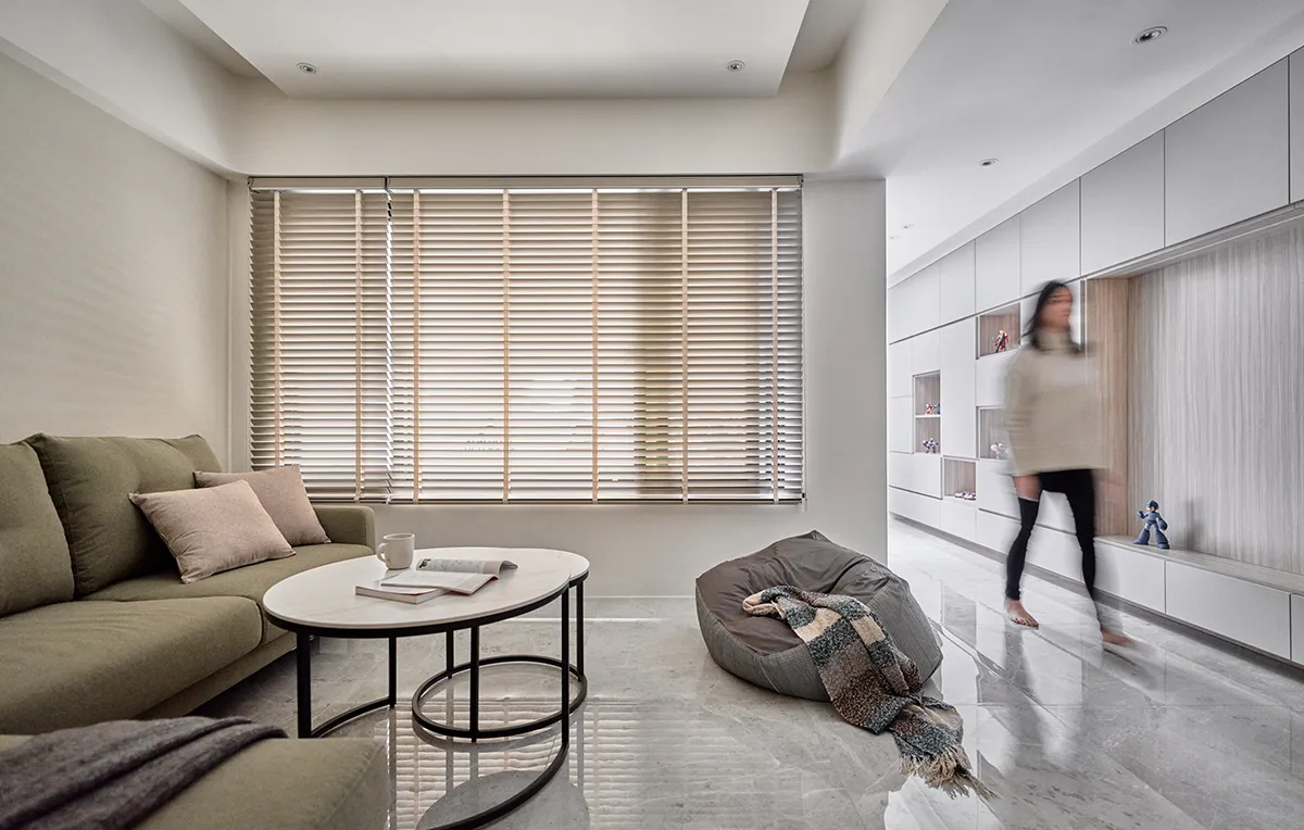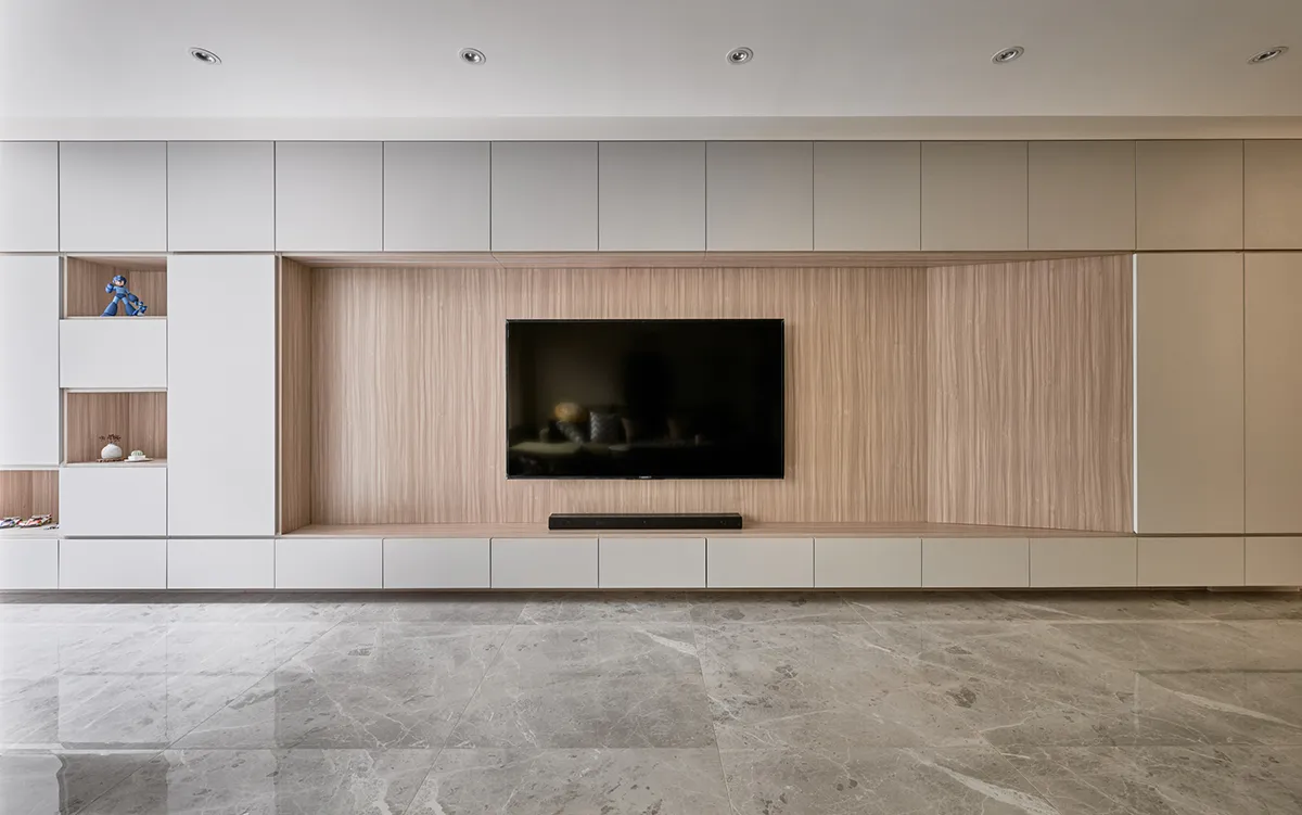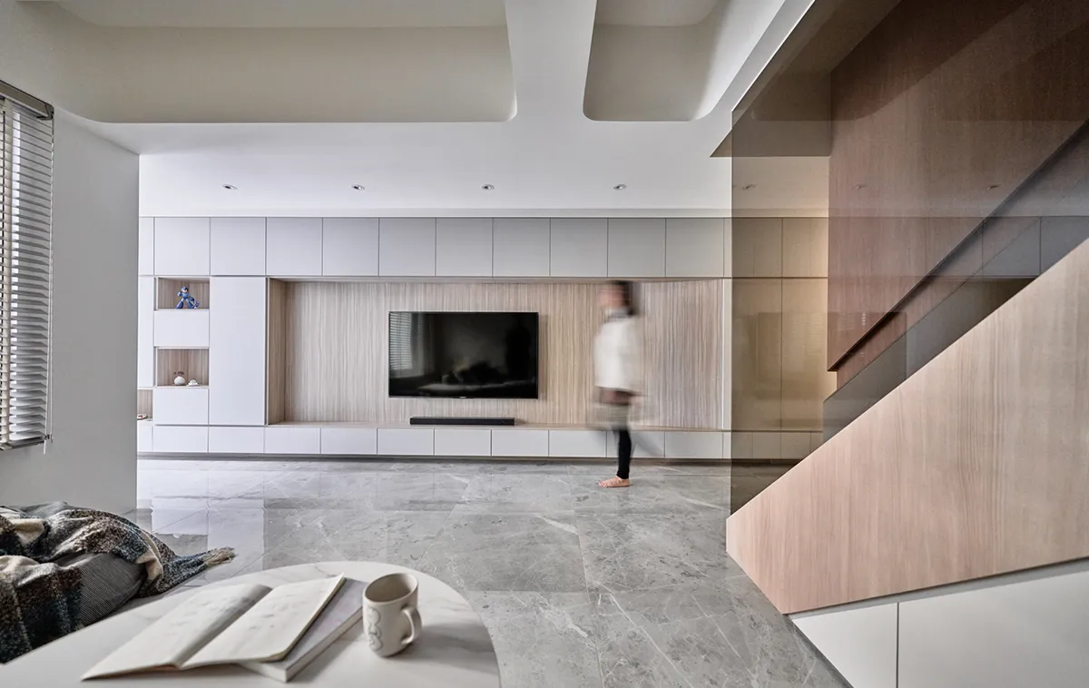原味色彩是串連整體家宅主題,在系統櫃鋪排之下,為求於一致性脈絡,透過轉折 20 度小邊角,使白調與木質,從主景浮現出層次造型,漸次推向右側,緩升與白色櫃體相連,不僅帶來了視覺變化,亦平衡整體比例,在原味調性中仍覆滿流動感。