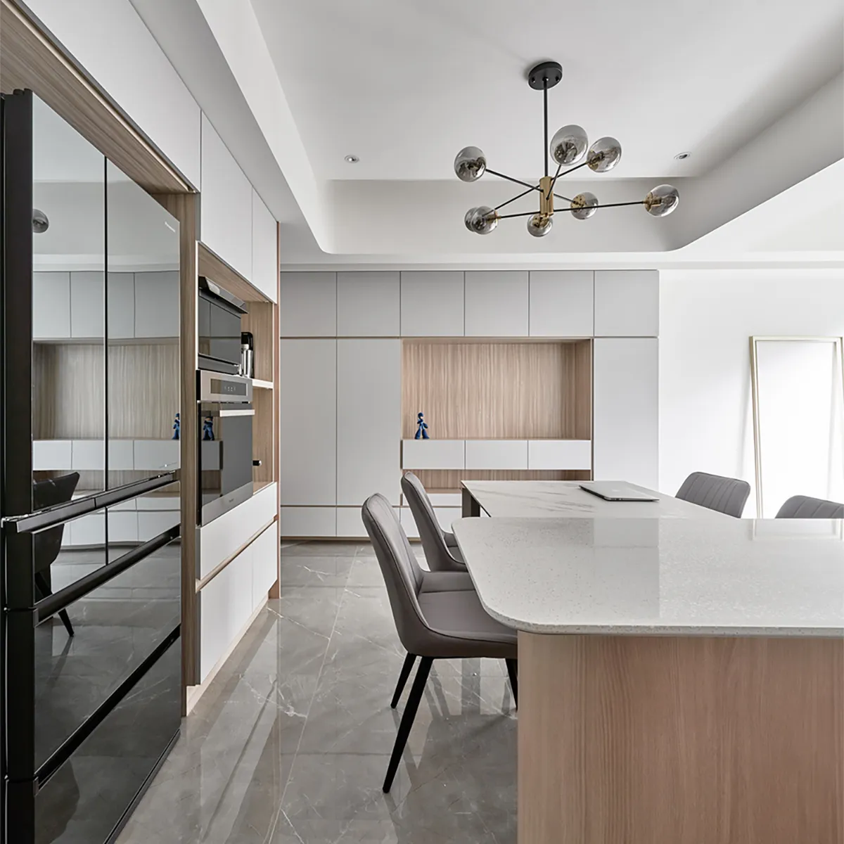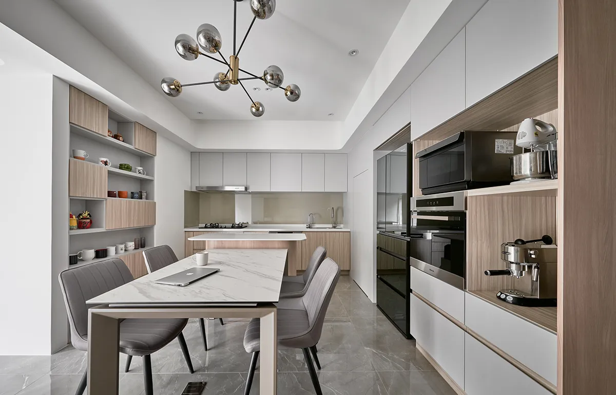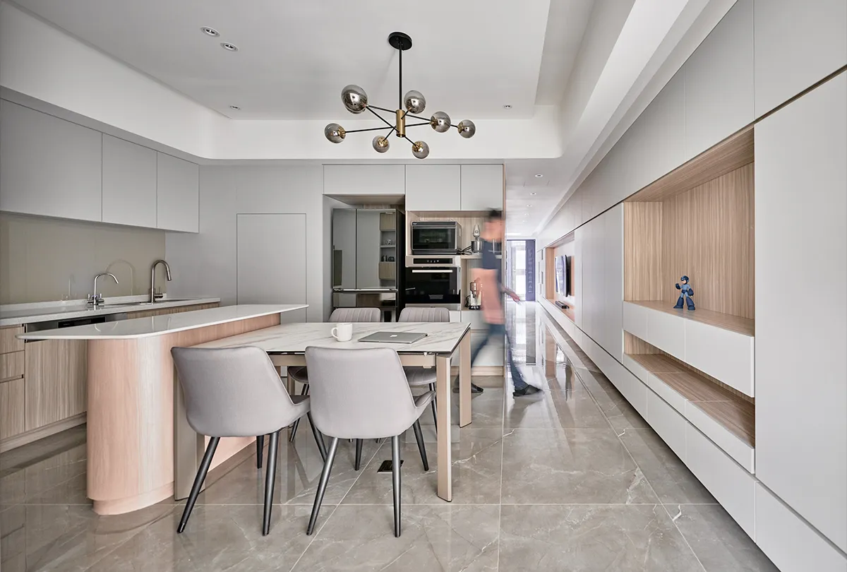 立面延續與客廳相同色系與材質,中島檯則在上方天花皆方角收邊之下,以圓弧角收折桌邊、櫃角,盡顯線條在一收一放間,自如釋放彈性。