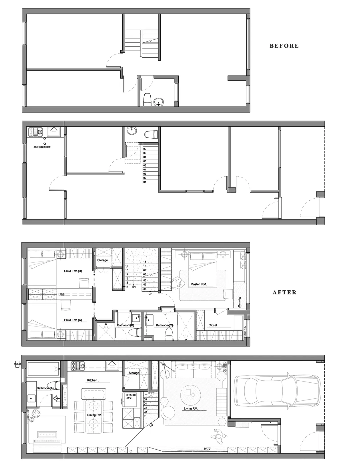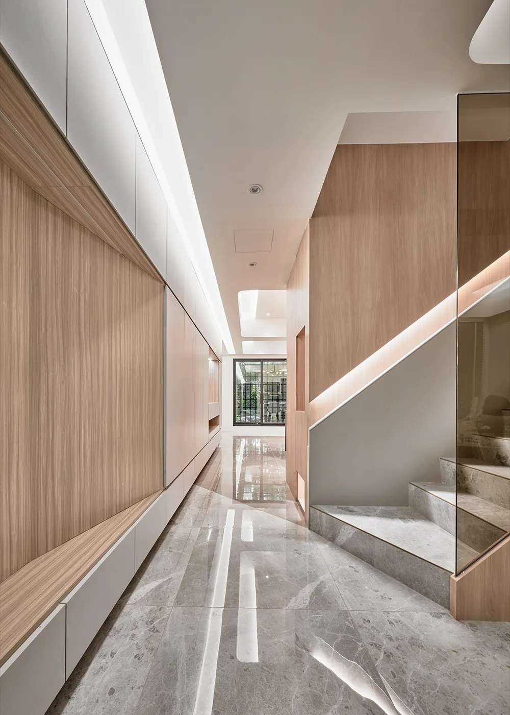 如今長型屋翻新,以住宅為主流,透天厝在擁擠城市內,能得一處仰天俯地獨立姿態,是許多人偏好的居住型態,但狹長型結構,導致自然光難以入室,造成隱蔽死角、空氣不流通現象,這也是本案最具挑戰之處,同時在團隊執業生涯中,從長型屋翻修為商空,至今轉而使光暈無跡,巧妙穿引入生活,是不同以往最大轉變。
