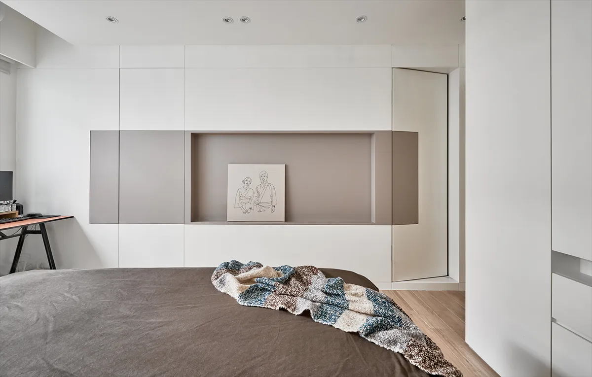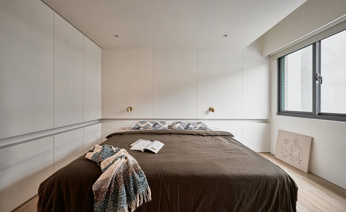 簡潔白色櫃體,與一抹藕粉色塊,妝點臥眠區,隨著雅致壁燈、柔和間接燈一明一亮,便能在專屬一隅,體現幽靜、靜心,漫享愜意生活。