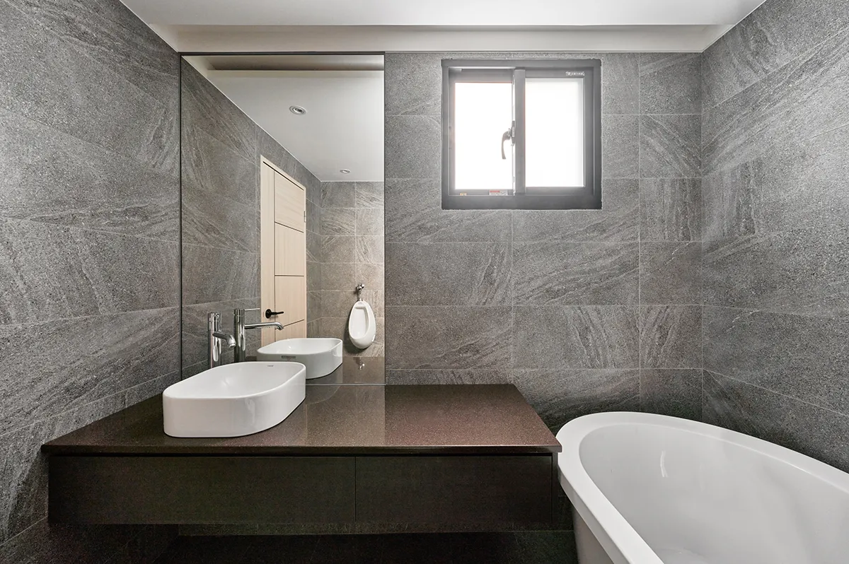 改變了原客浴方位,開一扇對外窗,灰壁面能接光引亮,反能突顯質感,置入一式浴罁,將盥洗檯面廓型增大,便於日常使用。