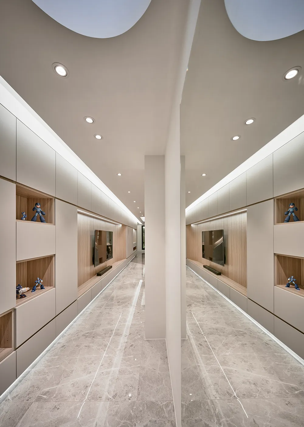 由於天花低處僅 2.25 米 ,刻意修飾為圓角天花,與光帶對映,可以消弭稜角壓迫感,收整銳利光束,達成平衡比例。